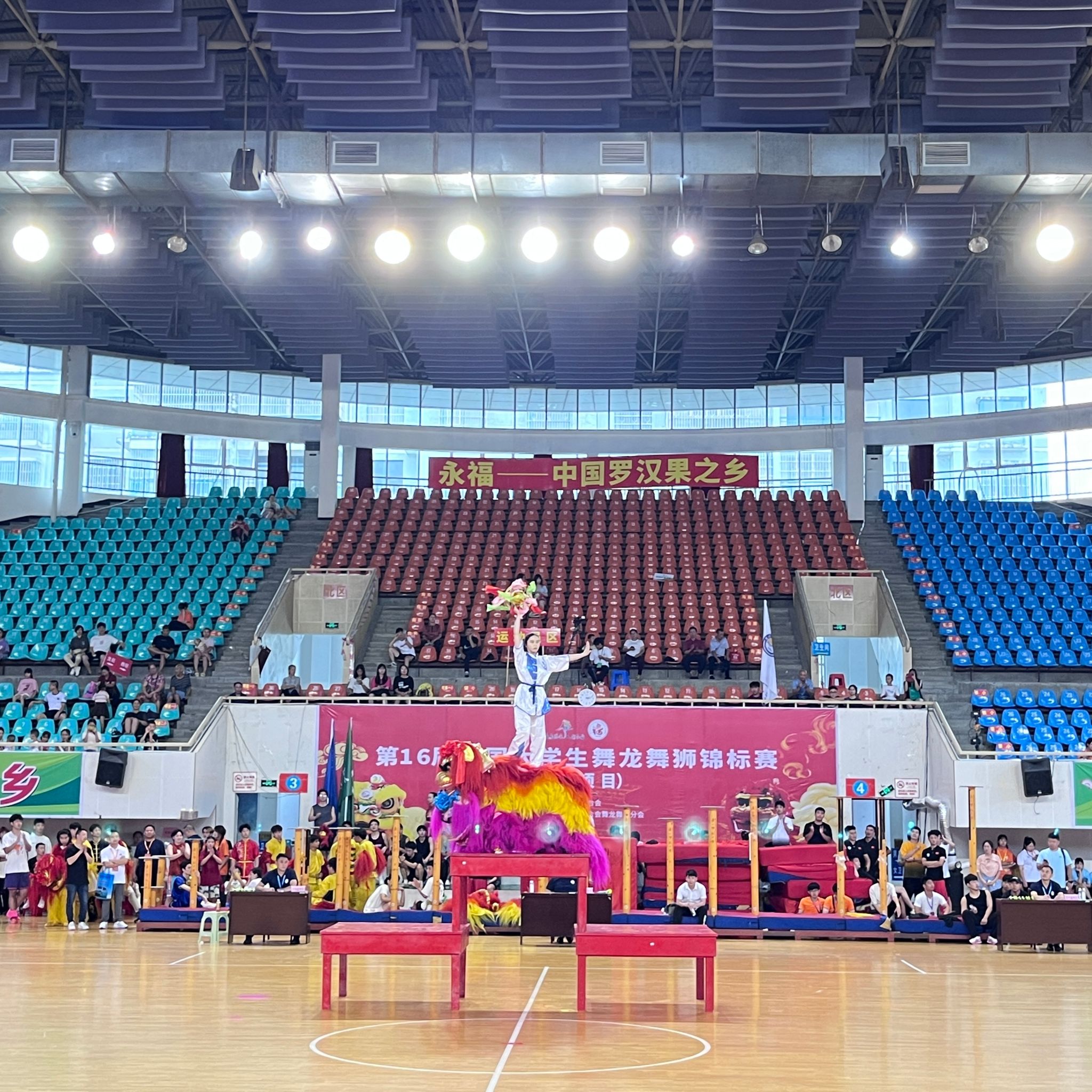 (本网讯)2024年7月29日,为期三天的第16届中国大学生舞龙舞狮锦标赛在广西永福县体育馆圆满收官。本次比赛由中国学生体育联合会主办、桂林市永福县人民政府承办,吸引了来自全国各地的44所高等院校的舞狮队共计600余名运动员参赛。beat365官网舞龙舞狮队经过五个月的艰苦备战训练,组织女子运动员5名,男子运动员10名参加此次比赛。