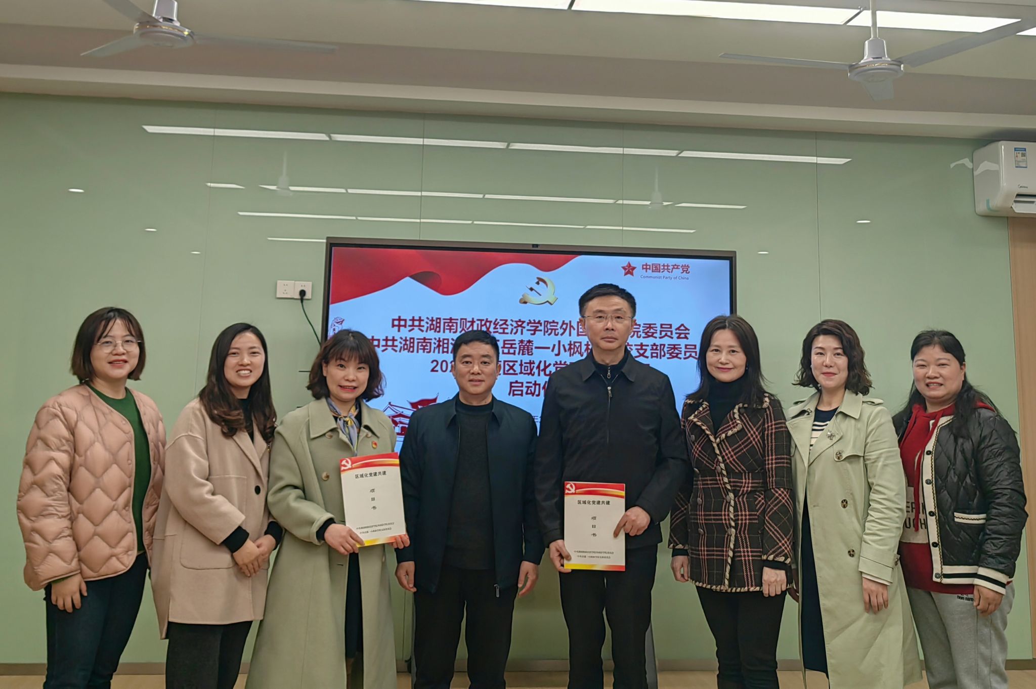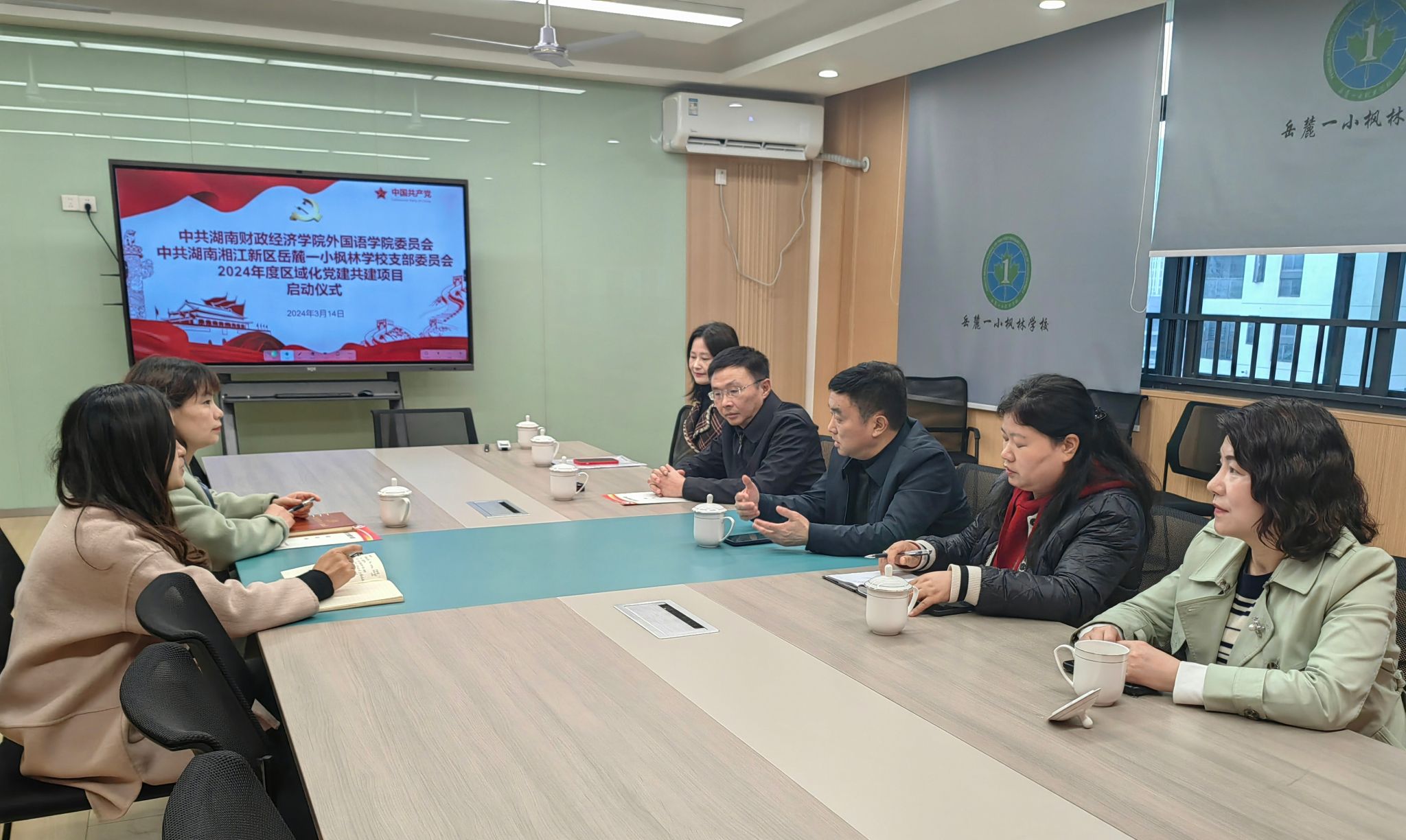 (本网讯)为进一步深化区域化党建共建工作,加强校地合作与交流,在咸嘉湖街道西大门社区的牵线搭桥下,外国语学院与长沙市湘江新区岳麓一小枫林学校达成结对共建意向。3月14日下午,区域化党建共建项目启动仪式在岳麓一小枫林学校顺利进行,双方在与会人员的共同见证下签署了《区域党建共建项目书》。外国语学院党委书记蒋勇威、副院长黄越、副书记张鹏、西大门社区党总支书记冯志锋、西大门社区党总支委员、妇联主席谭波、岳麓一小枫林学校校长李婷参加了启动仪式。
