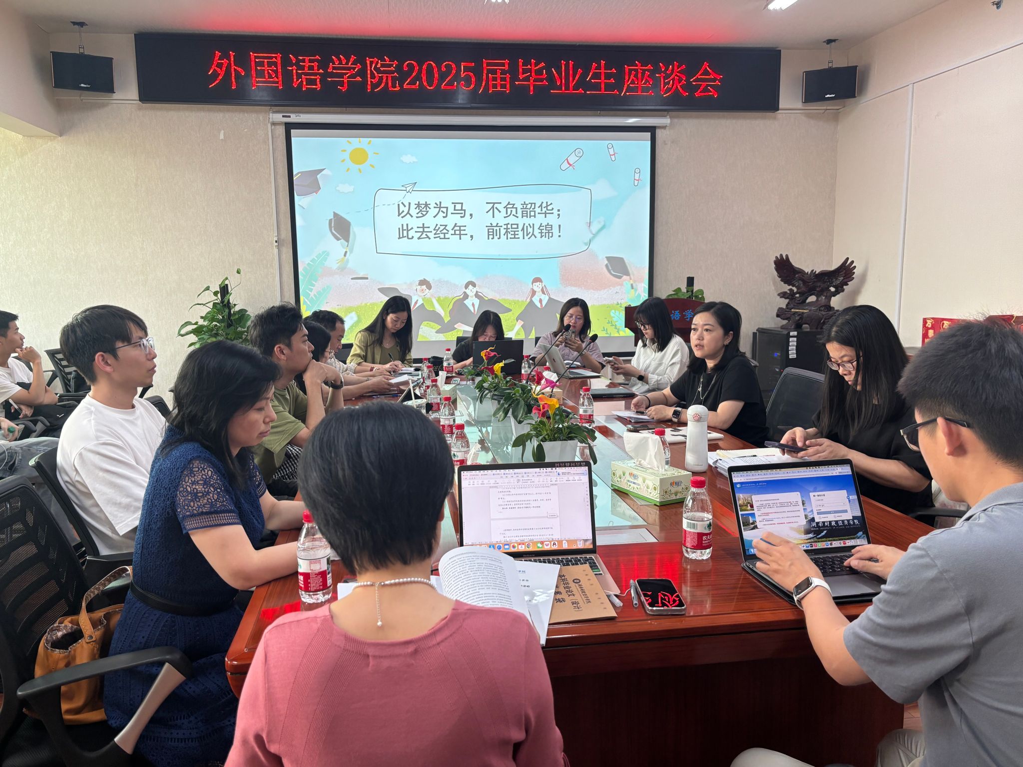 为倾听毕业生心声,凝聚发展共识,6月4日下午,外国语学院在办公楼315会议室召开2025届毕业生座谈会。学院班子成员、四办主任、各专业系正副主任、专业负责人以及毕业生代表参加会议。会议由副院长李曦主持。