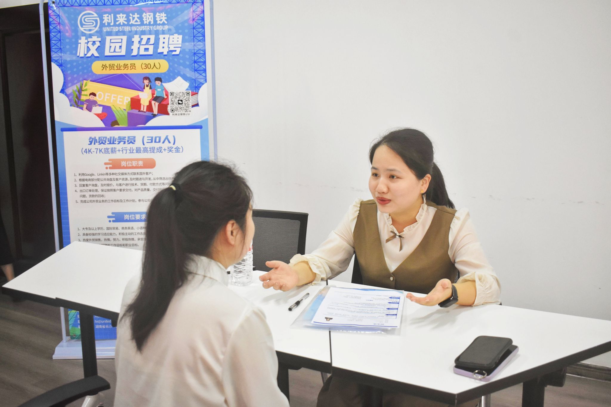 (本网讯)为促进2024届毕业生充分高质量就业,进一步推进“校友回湘”工作部署,4月29日上午9:00,外国语学院在办公楼315室、317室成功举办“beat365中文在线官网外国语2024届毕业生专场招聘会”。广东省有为市场营销策划有限公司、中山市迈锐照明科技有限公司、湖南利来达钢铁有限公司等多家校友企业来校参加。外国语学院党委书记蒋勇威、副院长李曦、党委副书记张鹏、学工办主任肖枝叶、教科办主任殷琛、办公室主任杨慧、法小鹰副教授亲临现场指导。