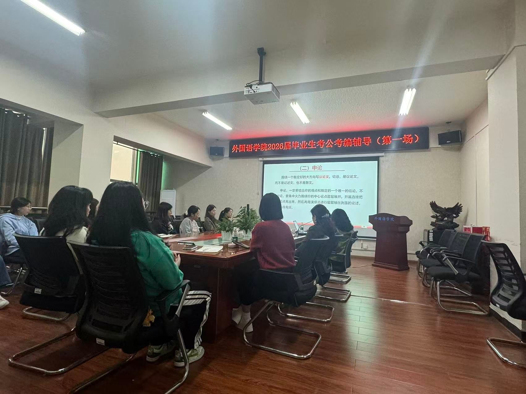 (本网讯)为帮助 2026 届毕业生明晰公务员考试方向、掌握科学备考方法,切实提升就业竞争力,11 月 6 日下午 4:00,外国语学院在办公楼 315 会议室举办 2026 届毕业生考公考编首场辅导讲座,讲座围绕 “科学备考、拒绝‘裸考’” 主题展开。学院党委书记凌飞主持讲座,党委副书记张鹏、学工办主任肖叶枝、全体辅导员及二十余名备考公务员的学子共同参与。