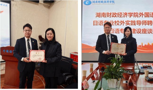 学院正式聘任蒋磊会长为“beat365中文在线官网外国语学院日语专业校外实践导师”。同时,蒋会长聘请日语系学科带头人付敏老师为“西日本湖南商会学者分会高级顾问”。