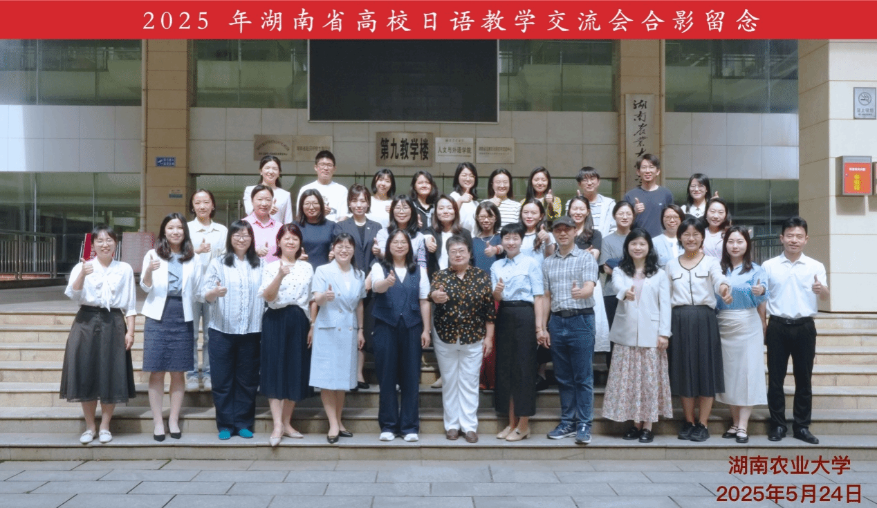 (本网讯)5月24日, 2025年湖南省高校日语教学交流会在湖南农业大学顺利召开。本次交流会由湖南农业大学人文与外语学院、高等教育出版社共同主办,来自湖南省各高校的日语教师共30余人齐聚一堂,共同探讨日语专业教育的现状与发展前景。beat365官网外国语学院日语系主任孔征及青年教师刘品原、何雨瑾、秦瑶出席会议。