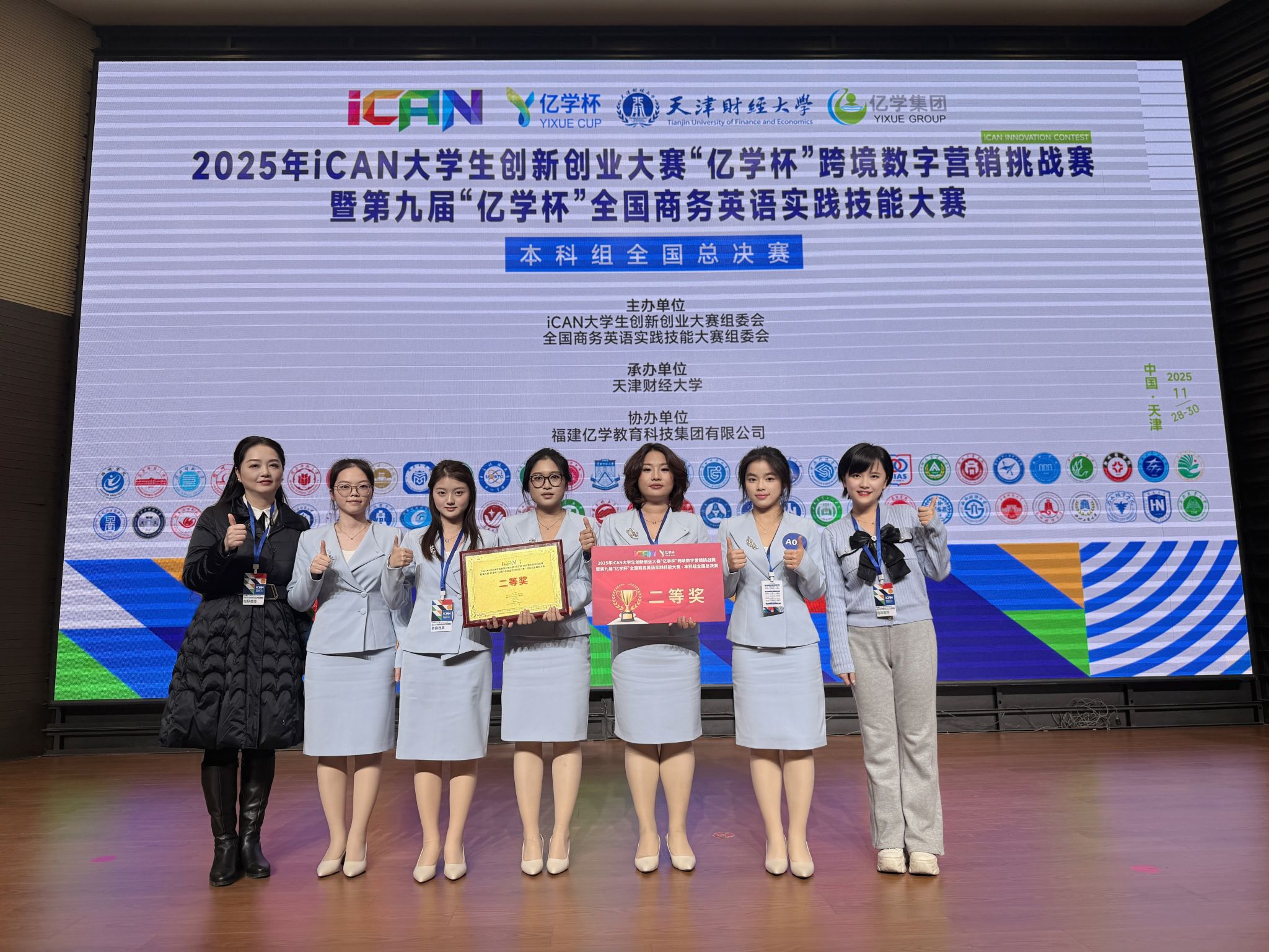 (本网讯)11月28日-29日,2025年iCAN大学生创新创业大赛“亿学杯”跨境数字营销挑战赛全国总决赛暨第九届“亿学杯”全国商务英语实践技能大赛总决赛在天津财经大学圆满落幕。beat365官网外国语学院代表队历经多轮比拼,在全国高校队伍的激烈竞争中脱颖而出,最终斩获全国总决赛二等奖,充分展现了beat365官网学子扎实的跨学科综合实践能力与国际化商务素养。此次参赛团队由外国语学院邱高、法小鹰老师联合指导。