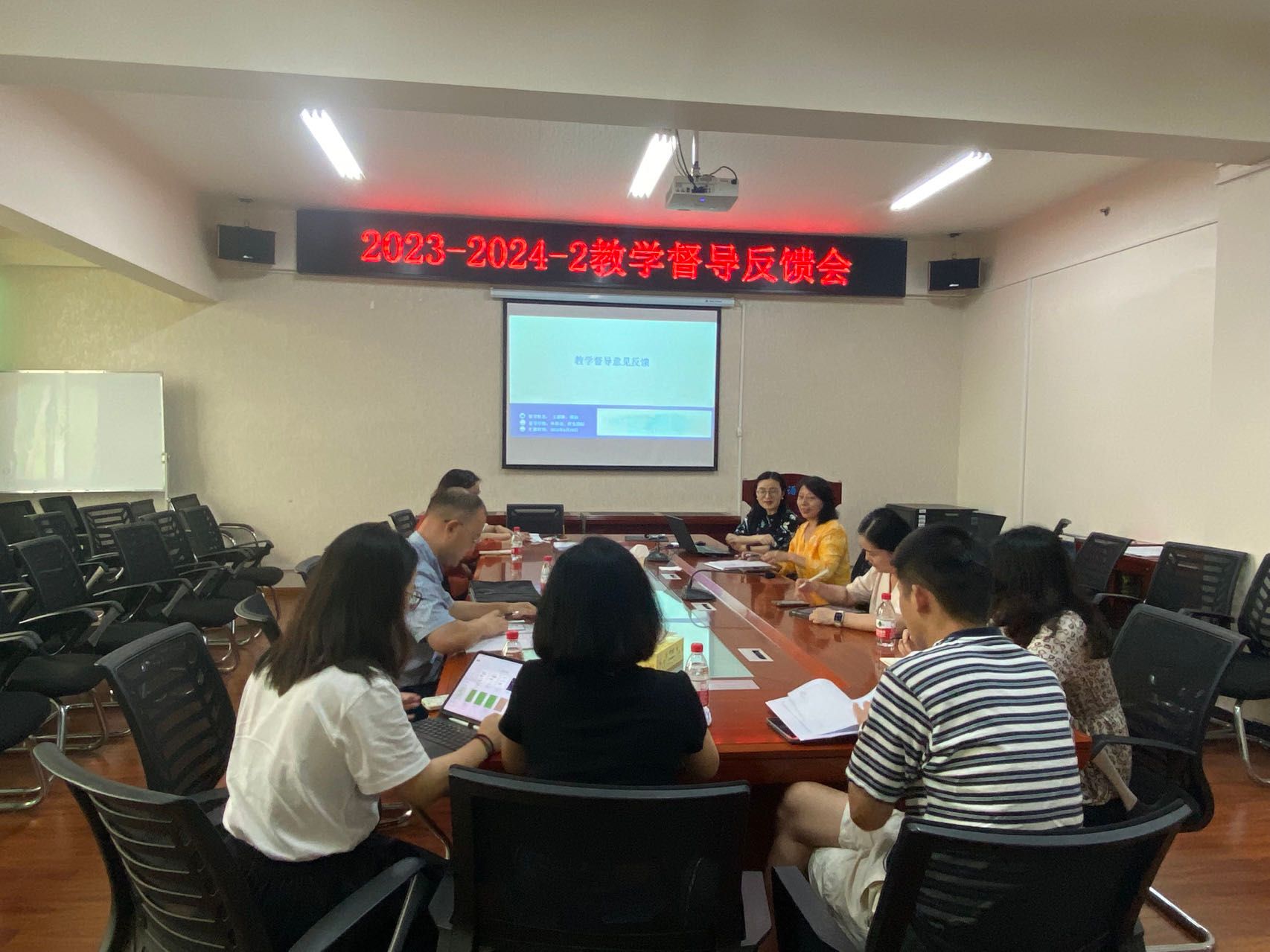 (本网讯)为进一步提升学我院课堂教学质量,促进教师教育教学能力提升,6月12号下午四点,外国语学院在办公楼315会议室召开2023-2024学年第二学期教学督导反馈会,质评处副处长王依、校督导组专家王群琳教授、胡灿教授、外国语学院副院长李曦、副院长汪小英、教科办主任殷琛及各系部主任参加会议,会议由李曦主持。
