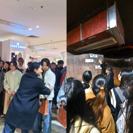 交流环节结束后,商场工作人员分组带领师生开展实地参观,通过实际案例,学习VMD的运用场景。同学们先后走访了商场各楼层店铺,近距离观察日本品牌的运营模式与服务特色,直观感受企业经营理念在实际工作中的落地实践。值得一提的是,师生们还一同参观了平和堂施工期间发掘的简牍古井遗迹,工作人员详细讲解了遗迹的发掘过程与历史价值,让同学们在专业实践之余,感受了湖湘文化与历史底蕴的交融,拓宽了文化视野。