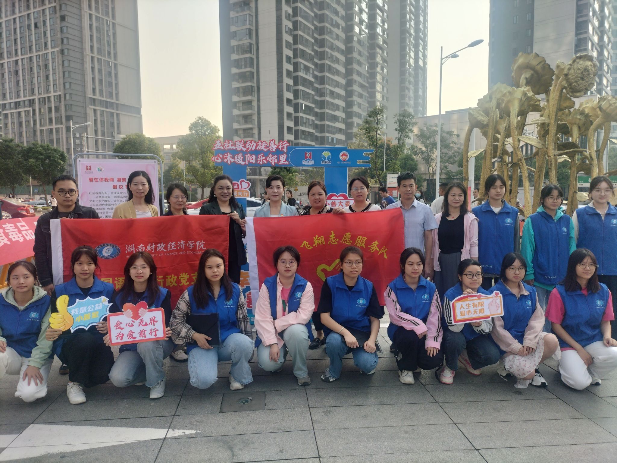 (本网讯)为扎实推进“五社联动 幸福邻里”工作走深做实,促进慈善与社工服务高质量融合发展,10月10日上午,西大门社区在向日葵广场举办了“五社联动凝善行,心沐暖阳乐邻里”慈社融合宣传活动。本次活动由长沙市民政局、湘江新区民政和社会保障局、湘江新区咸嘉湖街道工委指导,咸嘉湖街道西大门社区居民委员会主办。外国语学院作为共建单位受邀参与此次活动,学院党委书记凌飞、副院长汪小英、副书记张鹏以及行政党支部全体党员和16名语翼飞翔志愿服务队成员一同参与。