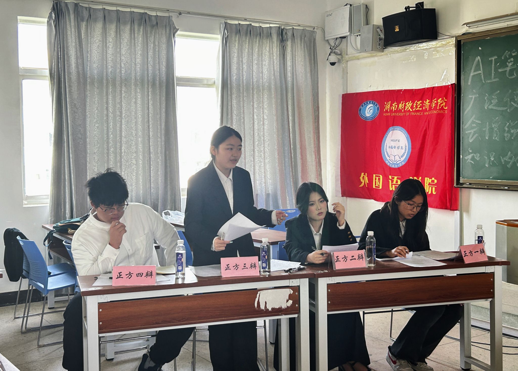 为深化创新人才培养体系,拓展学生科技视野,培育复合型素质人才,4月13日下午2点,外国语学院携手工商管理学院在主校区3501教室成功举办了“智汇财经,AI赋能”主题辩论赛。我院选派张婷、杨骅力、张阳阳和陈静宜四位辩手参加此次辩论赛。