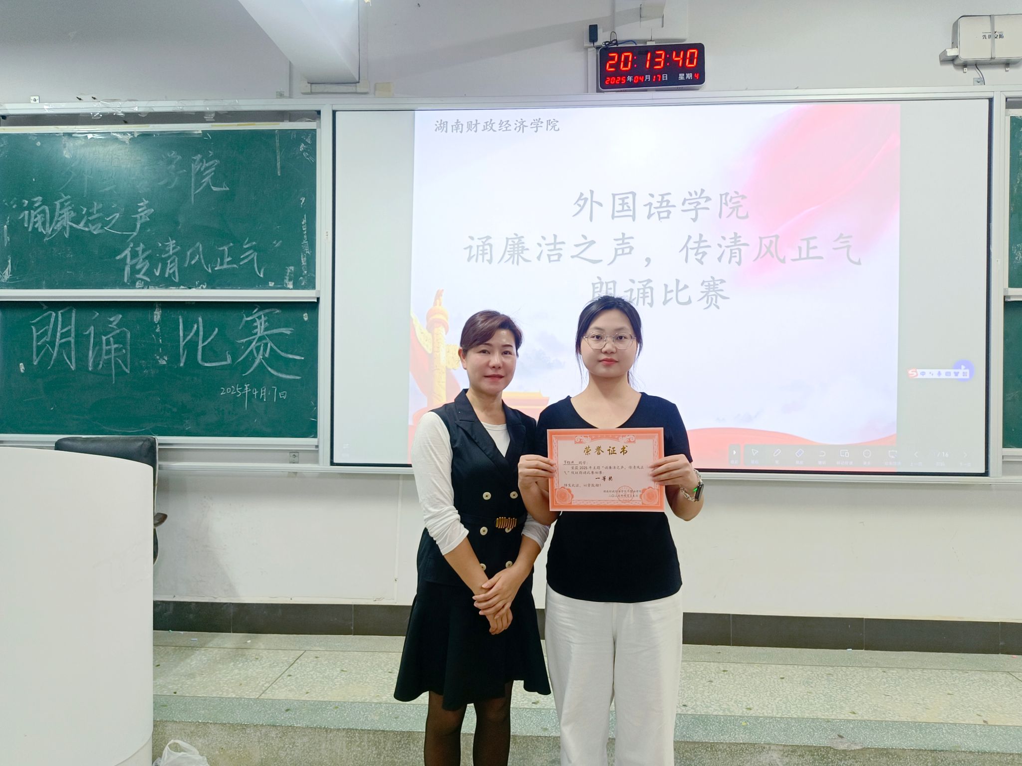 为深入推进新时代廉洁文化建设,以青年之声传递清风正气,4月17日晚上7点,外国语学院在主校区3110教室成功举办“诵廉洁之声,传清风之气”主题朗诵比赛。外国语学院党委副书记张鹏、院团总支书记胡文志及校主持队艺术团成员周星羽担任评委。