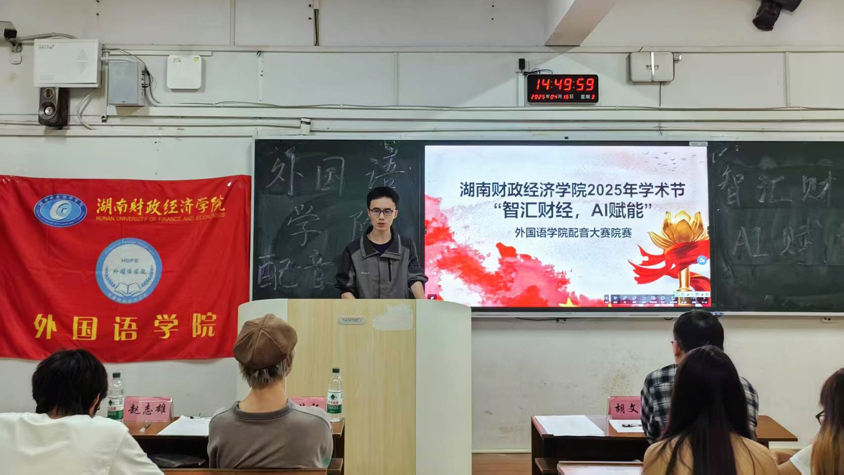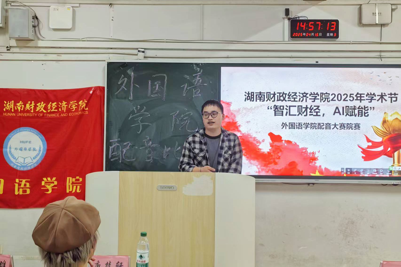 为激发学生对财经与AI融合的兴趣,提升语言表达与创意能力,促进科技与人文的进一步融合,4月16日下午2点,外国语学院在主校区3106教室举办“智汇财经,AI赋能”主题配音大赛初赛。外国语学院团总支书记胡文志、院团学会学业发展部部长唐楚轩以及院辩论队队长赵志雄担任评委。