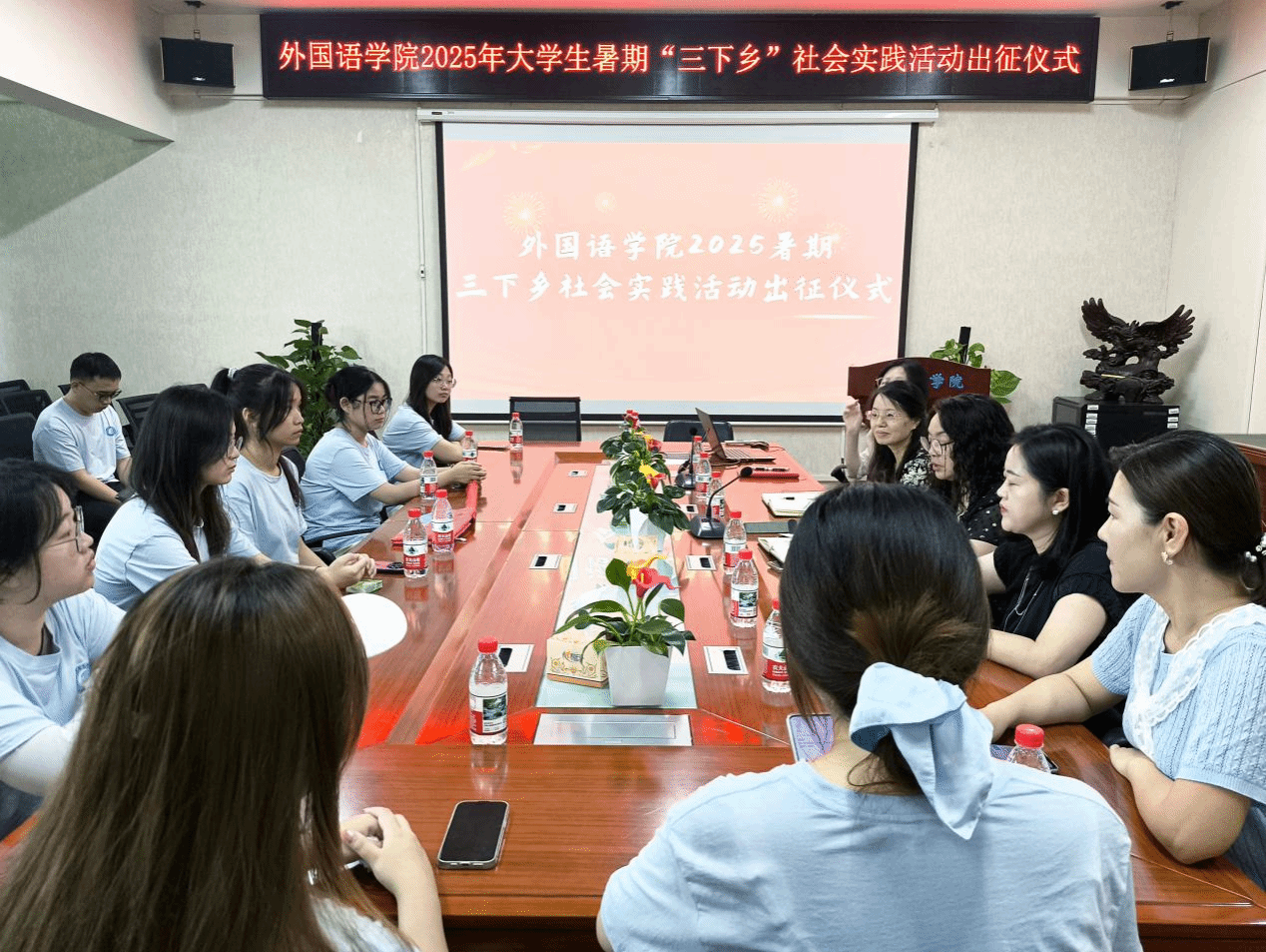 (本网讯)为深入践行习近平文化思想,全面贯彻落实党的二十大关于乡村振兴的战略部署,积极响应共青团中央“三下乡”社会实践活动的号召,7月3日上午,外国语学院在办公楼315隆重举行2025年暑期“三下乡”社会实践活动出征仪式。外国语学院党委书记凌飞、副书记张鹏、副院长汪小英、黄越、李曦,院团总支书记胡文志以及“语翼飞翔”志愿服务队全体队员共同参与,会议由张鹏主持。