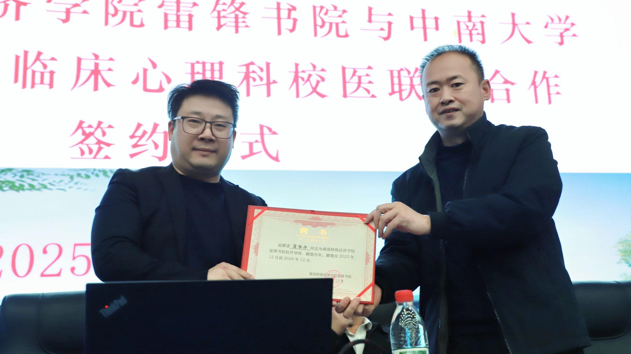 学生工作部部长欧阳海峰与中南大学湘雅三医院临床心理科主任蒲唯丹分别代表双方签订协议。雷锋书院常务副院长杨健向蒲唯丹颁发校外导师聘书。