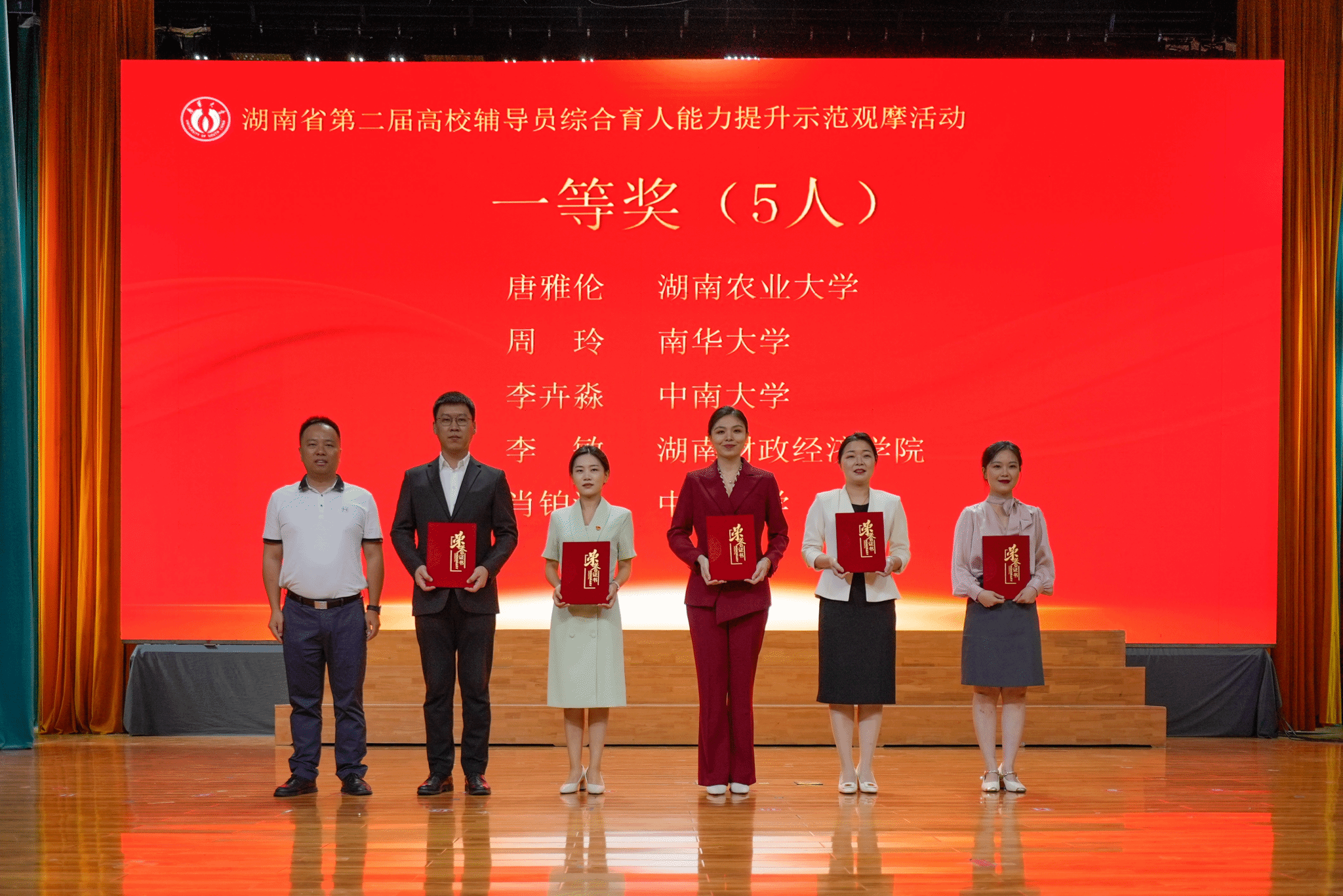 (本网讯)5月23日,湖南省第二届高校辅导员综合育人能力提升示范观摩赛在南华大学圆满结束。beat365官网会计学院辅导员李敏凭借卓越的专业能力和出色的现场表现,从全省129所高校130余名优秀辅导员中脱颖而出,一举夺得一等奖,实现了beat365官网在该项赛事中的历史性突破。