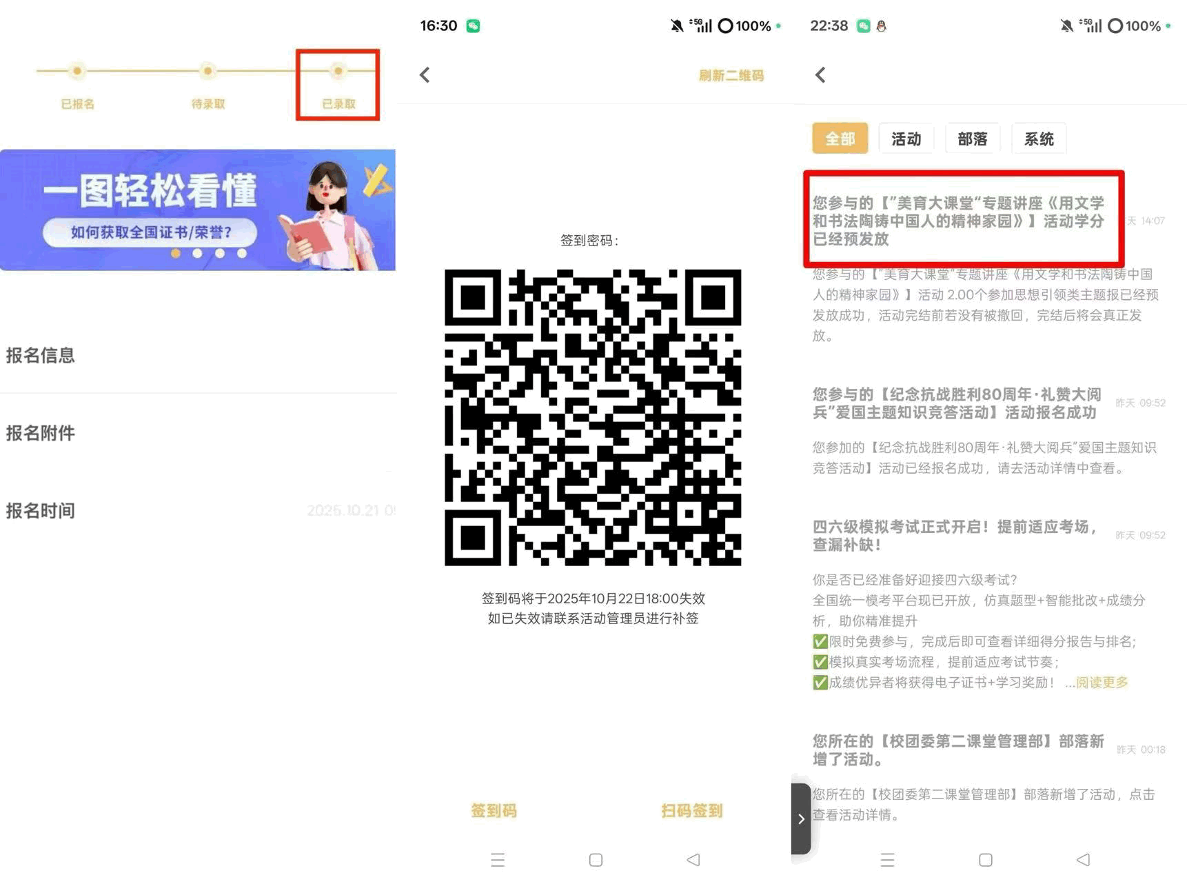 第二课堂是指在第一课堂(课表内课程教学、实践教学)之外,学生自愿参与的、有组织的各类旨在提升综合素质的活动,是第一课堂的有效延伸与有益补充。通过“第二课堂成绩单”制度实现活动的科学化、系统化、制度化管理,对学生参与情况进行可记录、可评价、可测量的客观呈现,与评奖评优、推优入党、就业推荐等挂钩。