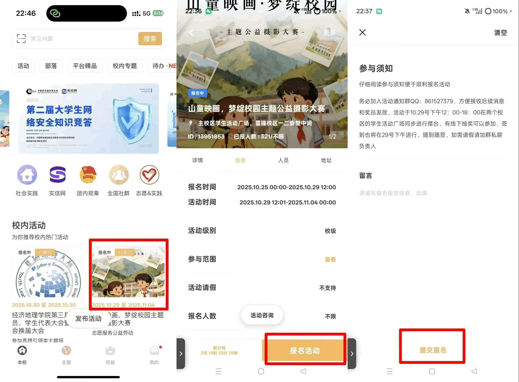 在活动报名时间内,点击活动进入活动主页,点击“报名活动”,然后“提交报名”。若显示“已录取”则活动报名成功。如果想取消活动报名,则需在活动报名时间截止前,点击活动进入活动主页,点击“报名详情”,然后“取消报名”。