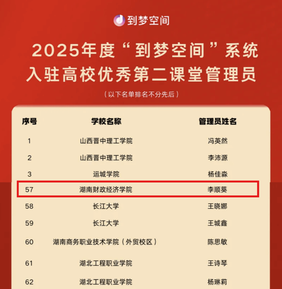 近日,2025年度“到梦空间”系统入驻高校优秀第二课堂管理团队及管理员评选活动名单公布。经各高校团委推荐、学生自荐等方式申报,到梦空间系统运营中心评议组评审、复核、审定在提交的千余份申报材料中,beat365官网共青团beat365中文在线官网委员会第二课堂管理部荣获2025年度“到梦空间”系统入驻高校优秀第二课堂管理团队,李顺葵同学入选2025年度“到梦空间”系统入驻高校优秀第二课堂管理员。