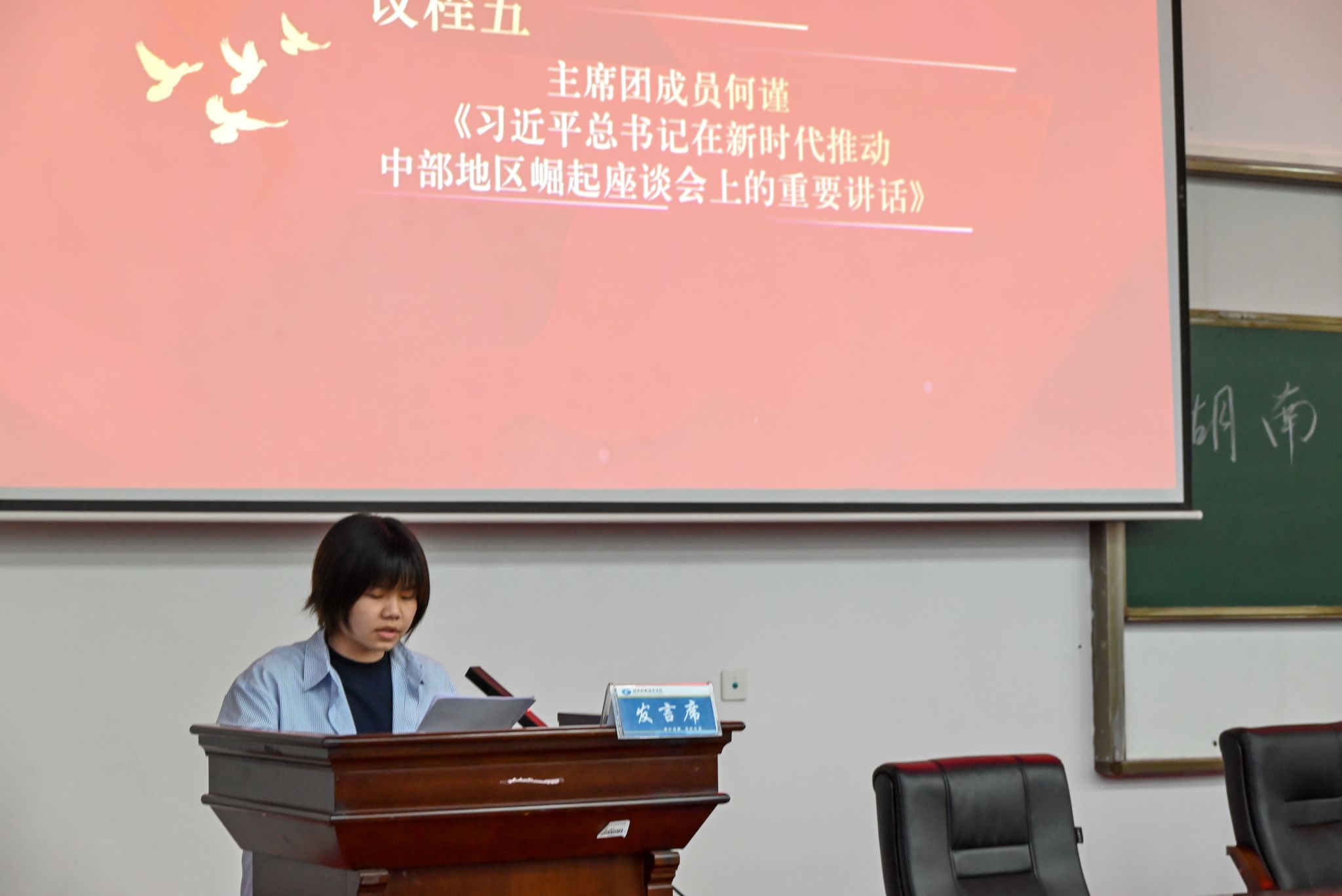 大会第五项,主席团成员何谨领学《习近平总书记在新时代推动中部地区崛起座谈会上的重要讲话》 ,她讲到要把中部地区的发展作为案例放到支撑学生会发展的未来实践中来定位思考,深入思考推动区域内部加强合作、整体联动等优秀案例事件,并将其运用转换在学生会未来发展中,提升学生会整体实力。