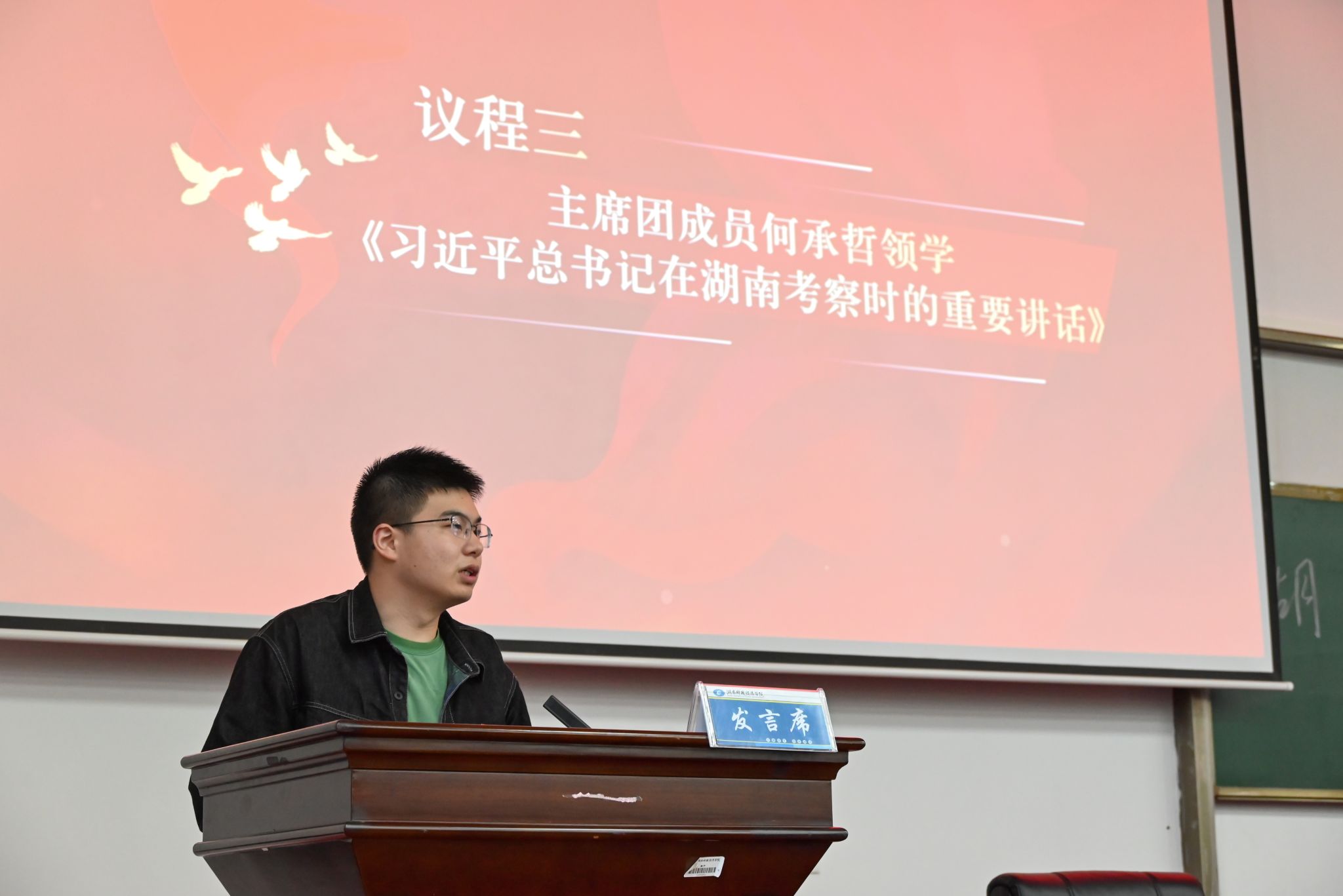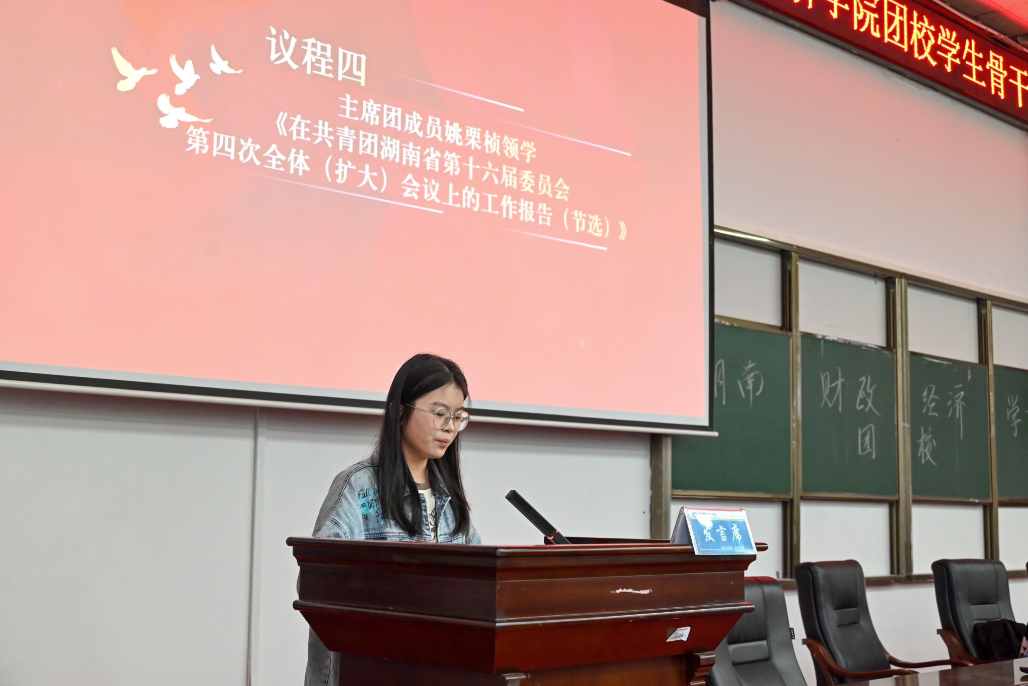 大会第四项,主席团成员姚栗桢领学《在共青团湖南省第十六届委员会第四次全体(扩大)会议上的工作报告(节选)》,她提出要以党的工作思想为核心,将其融入学生会工作的全过程,不断提升学生会思想政治工作的影响力、感染力、引领力。