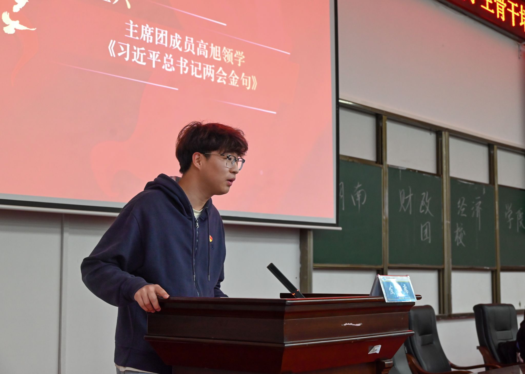 大会第六项,主席团成员高旭领学《习近平总书记两会金句》,他提到要紧跟国家高质量发展的步伐,为推动高质量发展,学生会要加大创新力度,谋划进一步深化改革的一系列举措,从实际出发,先破后立,将学生工作推上一个新的台阶,促进校园文化发展,为广大学生创造更好的校园文化氛围。