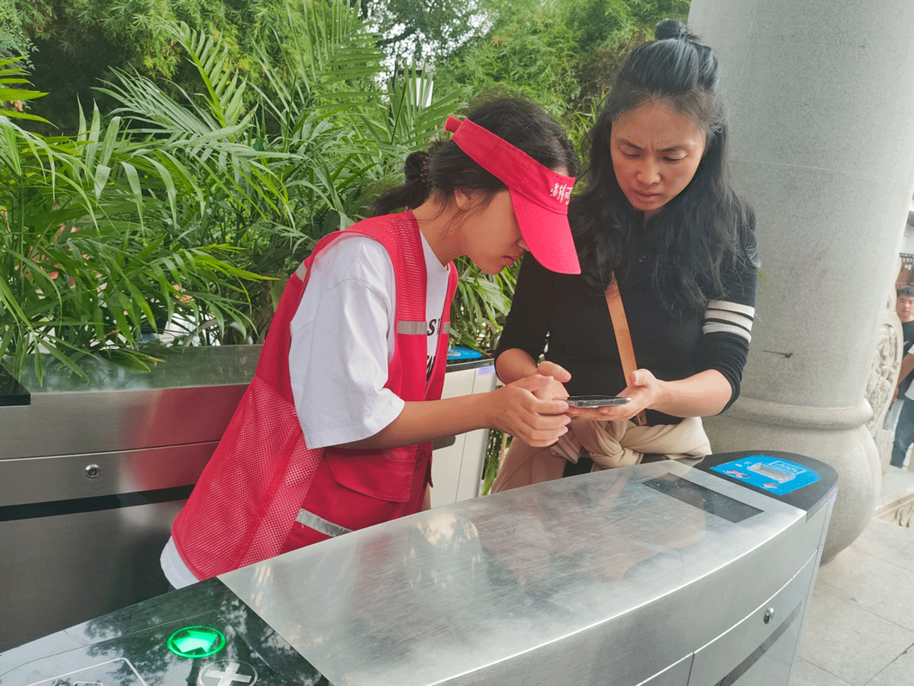 (图为beat365官网青年志愿者刘盼协助游客扫码入园 刘康摄)
