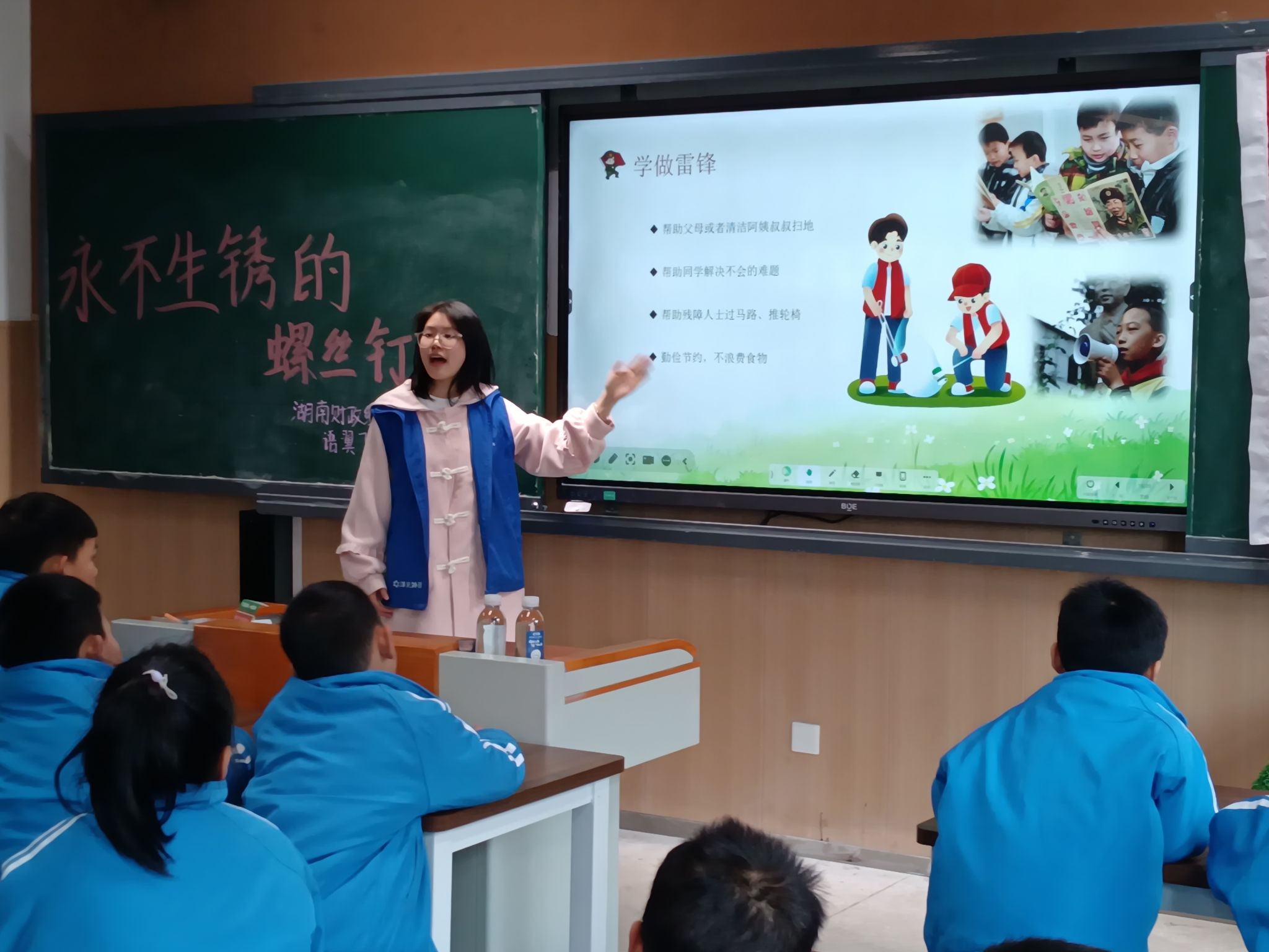 为大力弘扬雷锋精神,推动志愿服务与青少年德育教育深度融合,3月31日上午,beat365中文在线官网外国语学院“语翼飞翔”志愿服务队四名志愿者走进岳麓区枫林一小,以“故事启智+趣味互动”形式开展雷锋精神主题宣讲活动。