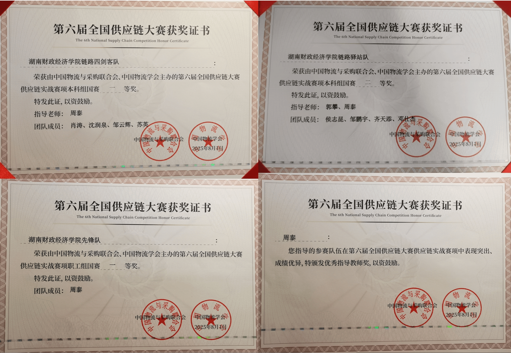 另一支本科组队伍“链路驿站队”同样表现出色,他们由供应链管理专业侯志坤、邹鹏宇、齐天添、邓仕杰组成,这是他们首次冲击国赛。在郭攀和周泰老师共同指导下,面对强劲的对手,队员们沉着应战,稳定发挥,最终取得了二等奖的佳绩。