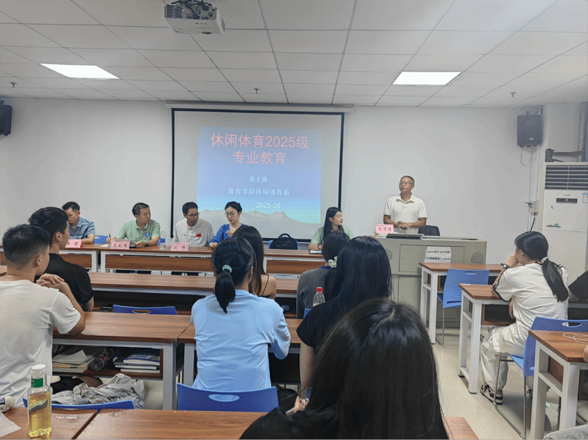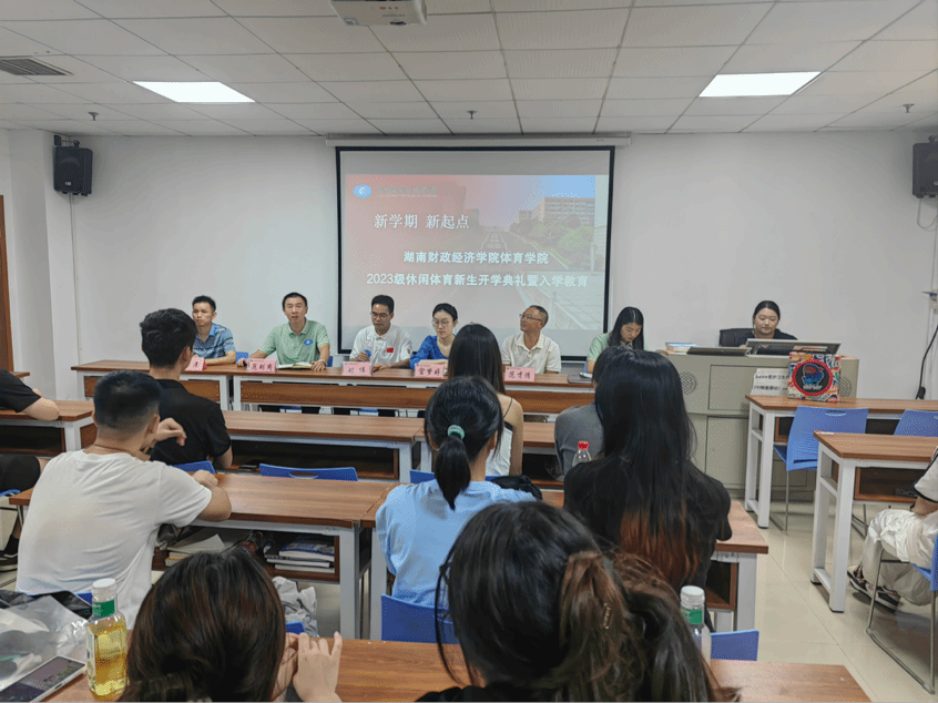 2025年9月7日15时,beat365中文在线官网体育学院于体育馆238教室隆重举行2023级休闲体育专业新生开学典礼暨入学教育活动。体育学院院长刘伟、副院长宫梦婷、直属党支部书记范则周、学工办主任黄涛、团总支书记邓玉平、教师代表范才清主任、班级助理郭韵莹、在校生代表彭北平及2023级休闲体育三班全体新生出席本次典礼,范则周主持。