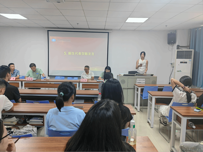新生代表贺敏在发言中回顾备考阶段的拼搏历程,向学院领导、教师及学长学姐致以诚挚谢意,并表示将珍惜机遇、严守纪律、团结同行,共同书写精彩的大学生活。
