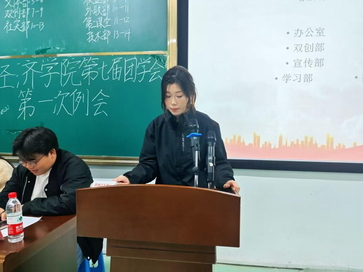 随后,主席团秘书长郭嬉结合自身在团学会的工作经历分享经验感悟,寄语全体团学会成员:需明确自身岗位职责,主动担当作为,积极投身团学会各项工作,全心全意为同学们提供服务;同时要始终重视学业发展,科学合理规划个人时间,实现工作与学习的协同推进。她着重强调,各部门要强化沟通协作意识,凝聚工作合力、携手并肩前行,共同为经济学院的平稳有序发展注入动力。