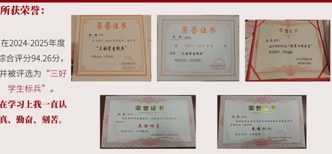 学习上始终保持认真勤奋、刻苦钻研的态度,专业成绩与综合测评稳居专业首位,多门核心课程表现突出,获评“三好学生标兵”“英语明星”等称号,以扎实的学业功底为成长铺路。
