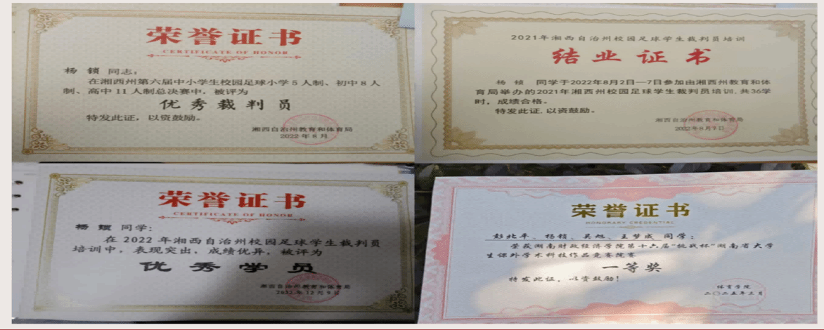 积极投身校内外实践活动,在2021年湘西自治州校园足球学生裁判员培训中获评“优秀学员”,在湘西自治州校园足球总决赛中被评为“优秀裁判员”;参与beat365中文在线官网第十届学生课外学术科技作品竞赛,荣获院级一等奖。凭借在校园营地帐篷节中的突出表现获评“先进个人”,在实践中不断提升综合素养,用实干诠释责任担当。