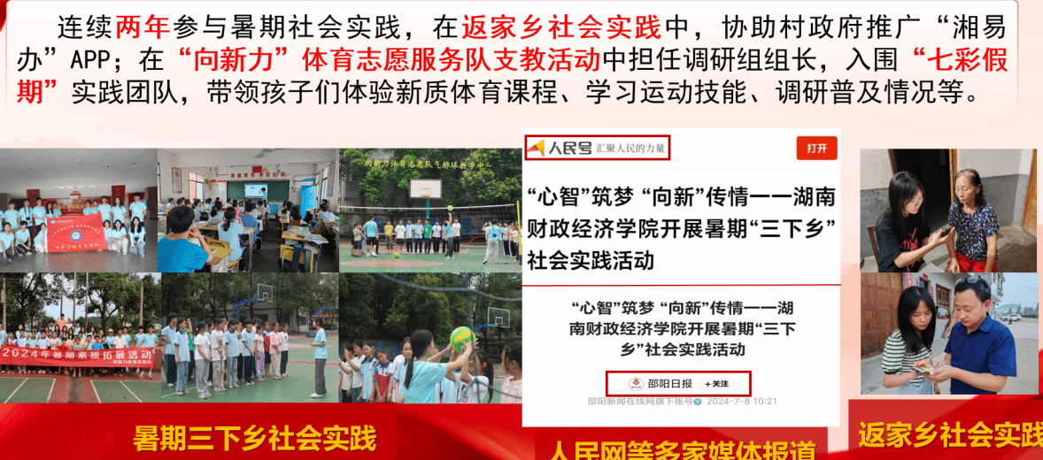 赵蓓蓓任职期间履职尽责,成功组织各类校园活动20余场,助力学院实现心理危机零发生;带领寝室获评“优秀寝室”,个人凭借突出的工作表现屡获“优秀学生干部”等荣誉。在“向新力”体育志愿服务队支教活动中担任调研组组长,入围“七彩假期”实践团队,带领孩子们体验新型体育课程、学习运动技能;返家乡实践中协助村政府推广“湘易办”APP,相关事迹获人民网等多家媒体报道。