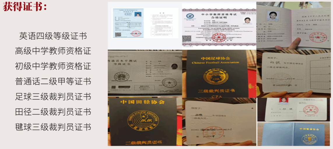专业技能功底深厚,持有高级中学教师资格证、初级中学教师资格证、英语四级证书、普通话二级甲等证书;考取中国足球协会三级裁判员、中国田径协会二级裁判员、毽球三级裁判员等多项专业资质证书,以过硬技能在专业领域崭露头角。