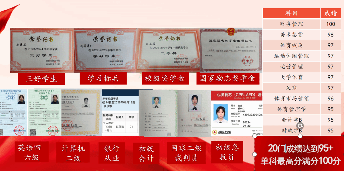 学业成绩尤为突出,20门课程成绩均达95分以上,多门核心课程斩获97分高分,《财务管理》更是取得满分佳绩。已顺利通过英语四六级、计算机二级等级考试,持有会计从业(初级)、网球二级裁判员、心肺复苏(CPR+AED)初级急救员等多项职业资格证书,以扎实的专业功底筑牢成长根基。