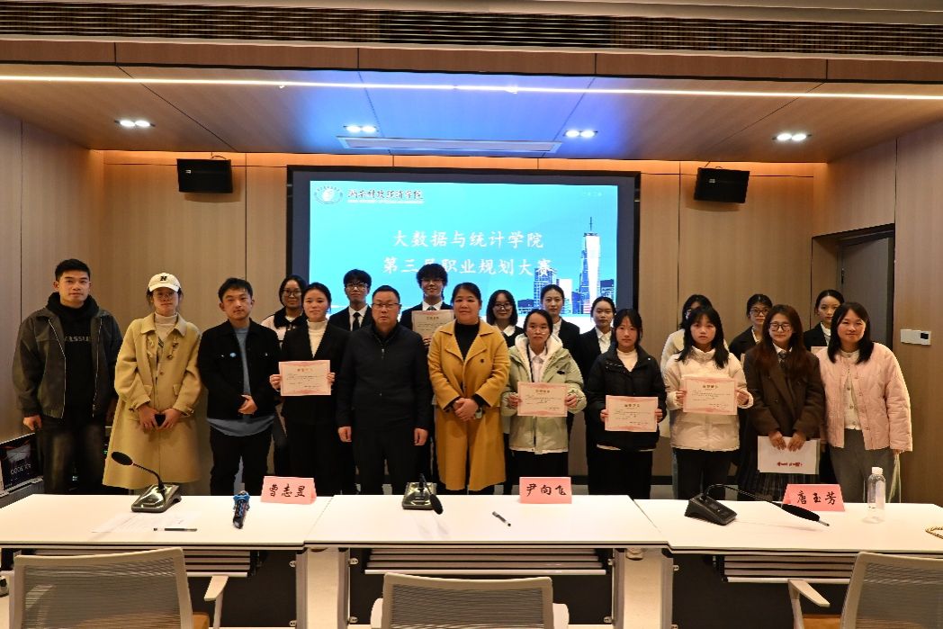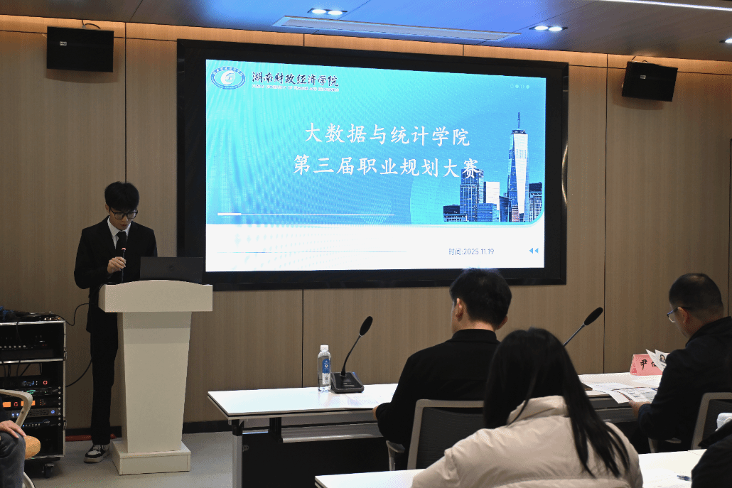11月19日晚,大数据与统计学院2025年大学生职业规划大赛院级选拔赛在一教学楼北201教室成功举办。本次大赛以“筑梦青春志在四方,规划启航职引未来”为主题,旨在引导学生科学规划学业与职业发展,提升职业竞争力。大赛邀请到院长尹向飞、专业教师曹志昱和唐玉芳担任评委,学院党总支书记王萱、学工办主任吴雅芳、团总支书记周真也亲临现场观摩指导。