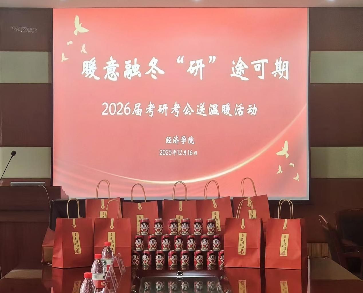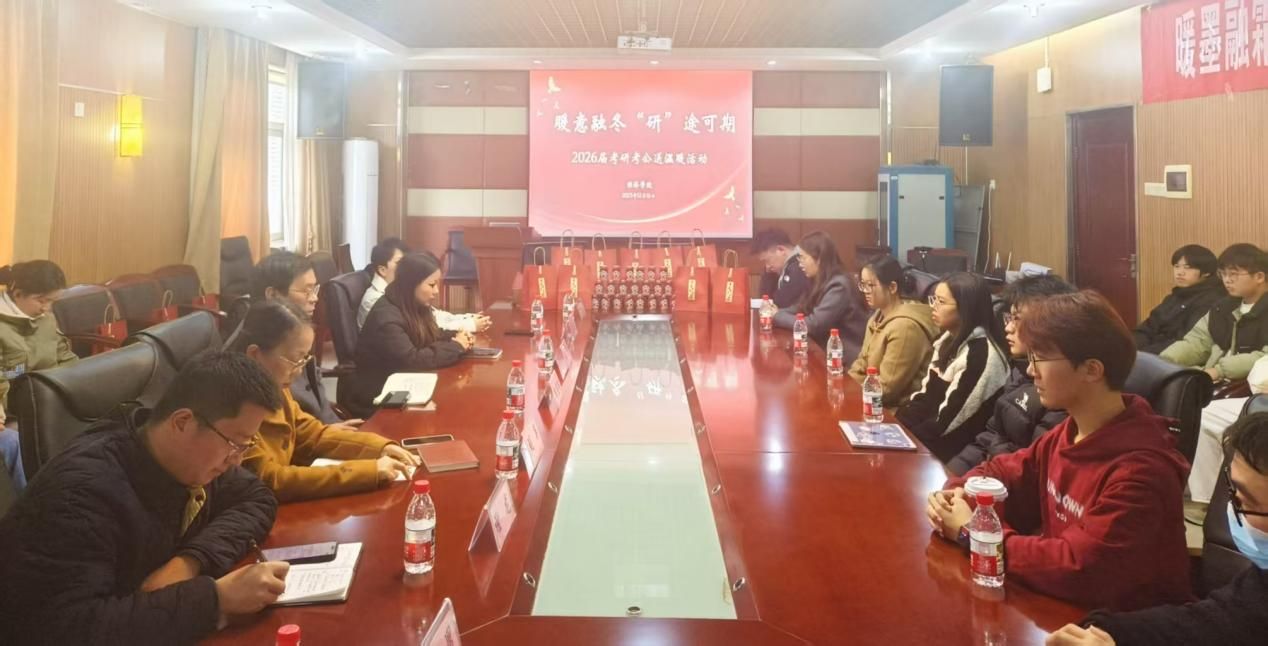 寒冬岁末,考研与考公备考进入冲刺攻坚阶段。为切实缓解学子备考压力,传递关怀与温暖,12月16日,beat365中文在线官网经济学院于办公楼1014会议室开展了“暖意融冬,‘研’途可期”2026届考研考公送温暖活动。