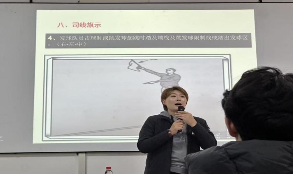 次日的实践课堂,更是检验学习成效、锤炼执裁硬功的实战阵地。授课老师现场示范执裁全流程,详解不同赛况的处置技巧。学员分组轮流上阵,深度参与模拟赛事执裁。从哨声响起后的精准裁决,到手势旗示的规范呈现,再到与记录台的高效协同,在高度还原的对抗场景中灵活运用理论知识,积累临场处置经验。