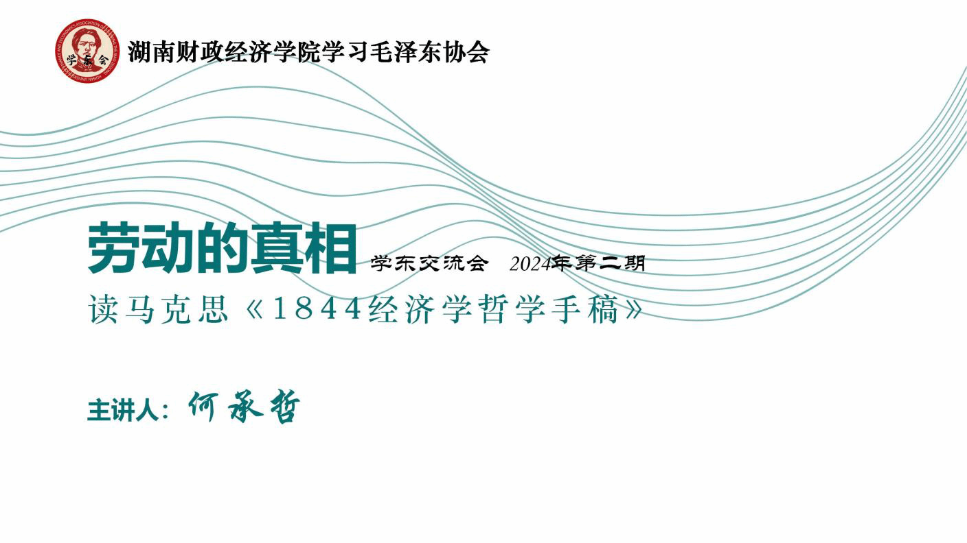 2024年3月17日下午14时,beat365官网学习毛泽东协会在大礼堂三楼会议室如期举行了2024年第二期学东交流会。本次交流会的主题是《劳动的真相——读马克思<1844经济学哲学手稿>》,由学东会会长何承哲同学担任主讲人。此外,来自湖南第一师范学院的罗奕欣、殷天怡两位同学作为外校嘉宾出席了此次活动。