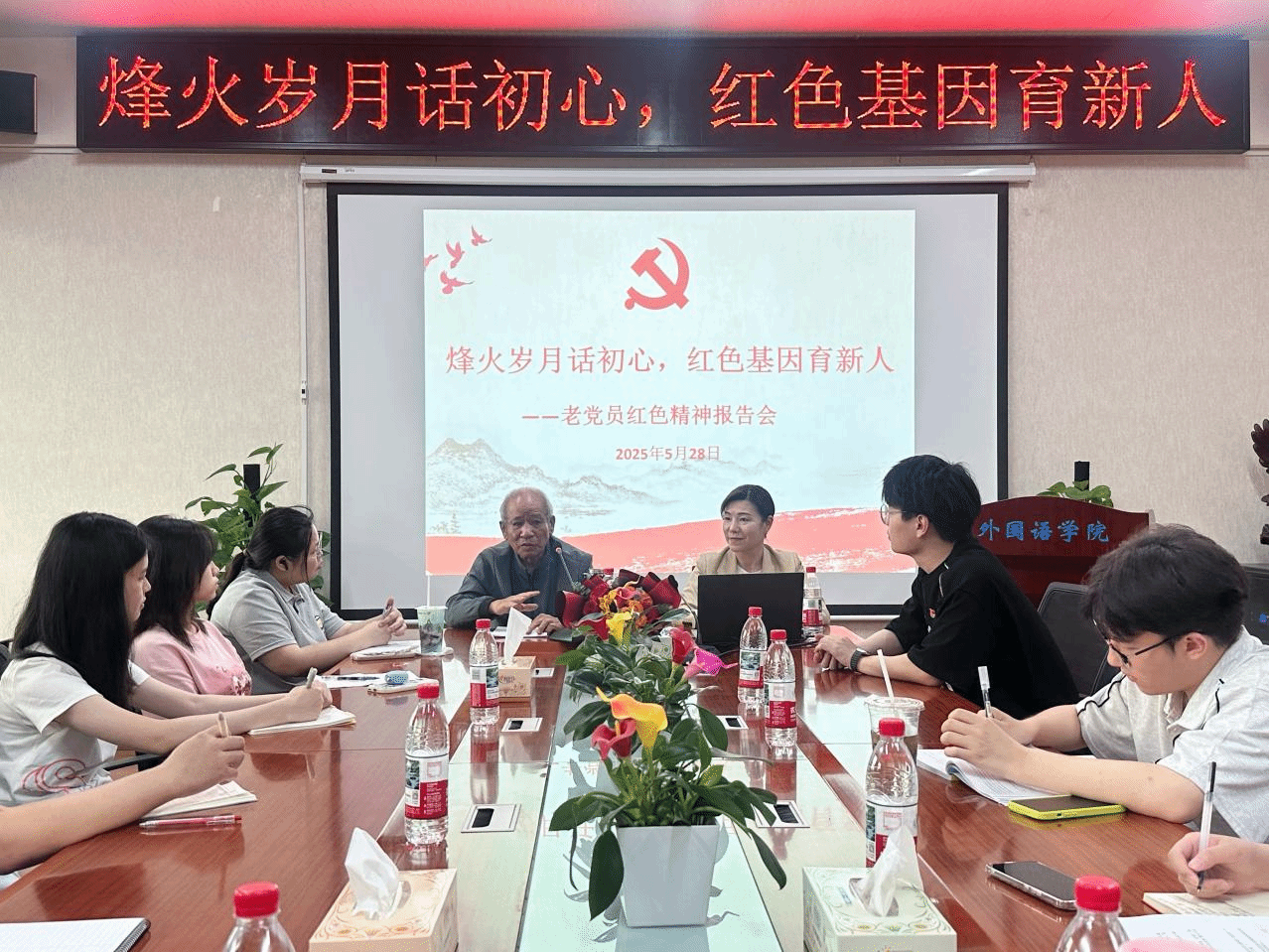 为进一步贯彻《beat365中文在线官网关心下一代工作委员会2025年工作要点》文件精神,加强外国语学院学生思想道德教育,5月28日下午,在办公楼315室组织了一场以“烽火岁月话初心,红色基因育新人”为主题的老党员红色精神报告会。本次报告会特邀82岁的抗美援越战争老战士、老党员石磊主讲,外国语学院党委副书记张鹏、院学生第二党支部书记代承轩以及2025年上半年全体入党积极分子一同参加。会议由代承轩主持。