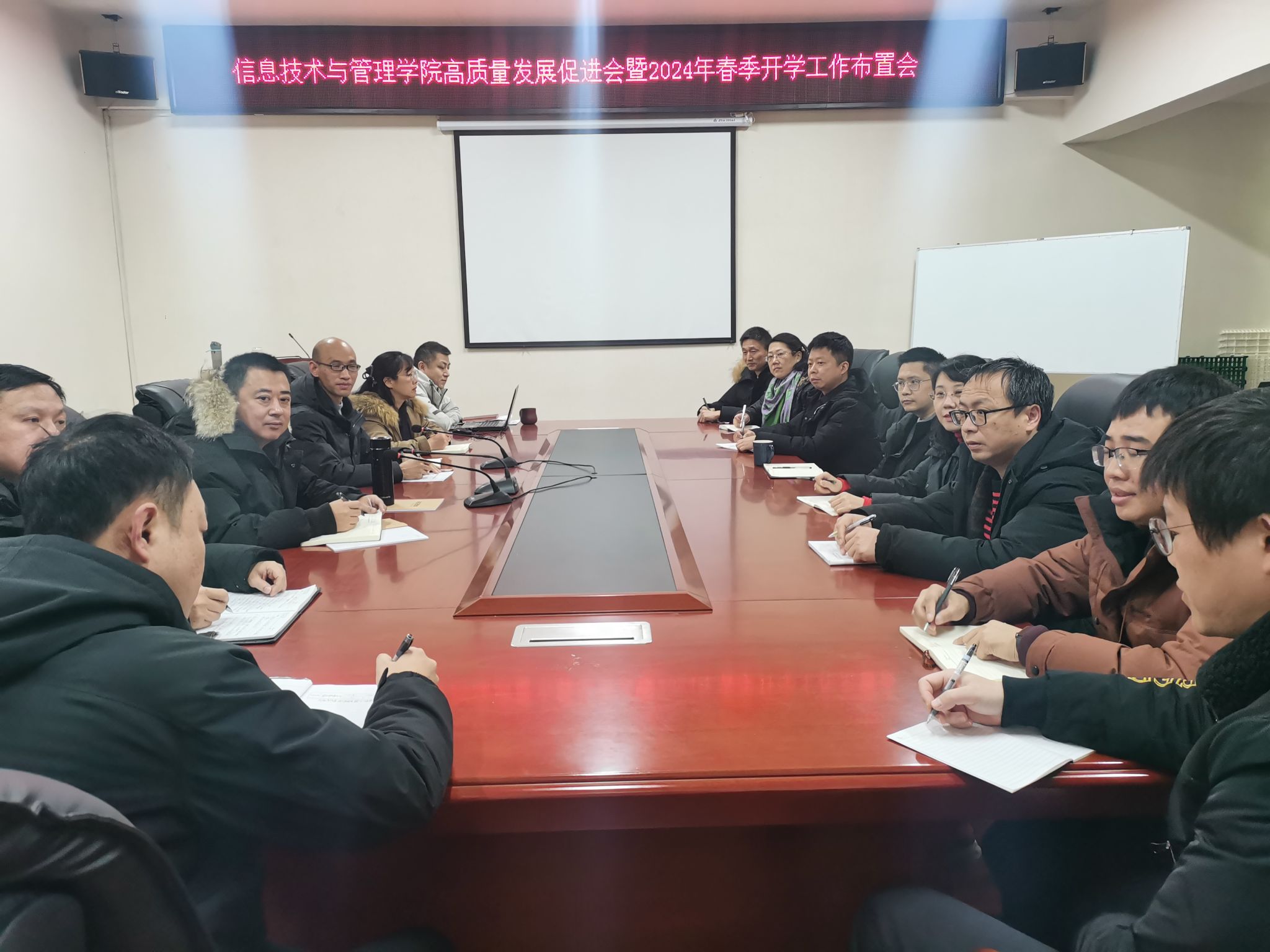 (本网讯)为进一步统一思想、凝聚发展合力,全面总结2023年工作成果,并积极布局2024年发展蓝图,信息技术与管理学院于2月22日上午在办公楼315会议室召开了主题为“促进高质量发展”的党政联席扩大会议暨2024年新学期开学工作布置会。会议由院长黄国华主持,党委书记孙光、副书记唐雄伟、副院长周航军、副院长郎琳及各系各科室负责人参加会议。