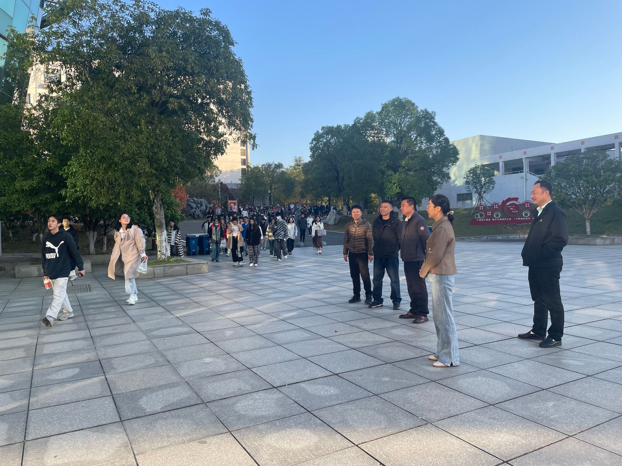 学院领导在教学楼前晨检考勤