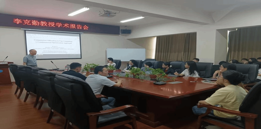 (本网讯)为进一步提升我院教师的科研创新能力,6月6日下午,信息技术与管理学院邀请国际知名学者李克勤教授在办公楼315会议室做“Computation Offloading in Fog Computing: A Combinatorial Optimization Approach”专题讲座。学院党委书记孙光、院长黄国华、青年博士教师和学院感兴趣的教师、以及学生科研代表参加了交流讲座,讲座由周航军副院长主持。