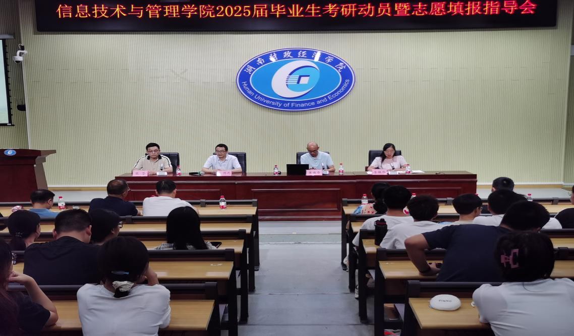 (本网讯)为动员广大考研学子坚定考研信心,下定决心积极报考,认真努力备考,全力以赴冲刺考研;同时,也为了给有意向报考研究生的同学提供辅导与帮助,2024年9月25日晚,信息技术与管理学院在二教2J03学术报告厅举行2025届毕业生考研动员暨志愿填报指导会。会议由学院党委副书记唐雄伟主持,院领导、六系主任、三办主任、专业教师代表、2025届毕业班辅导员、考研上岸的2024届毕业生代表、2025届考研学生以及其他年级有意向考研的学生参加了会议。