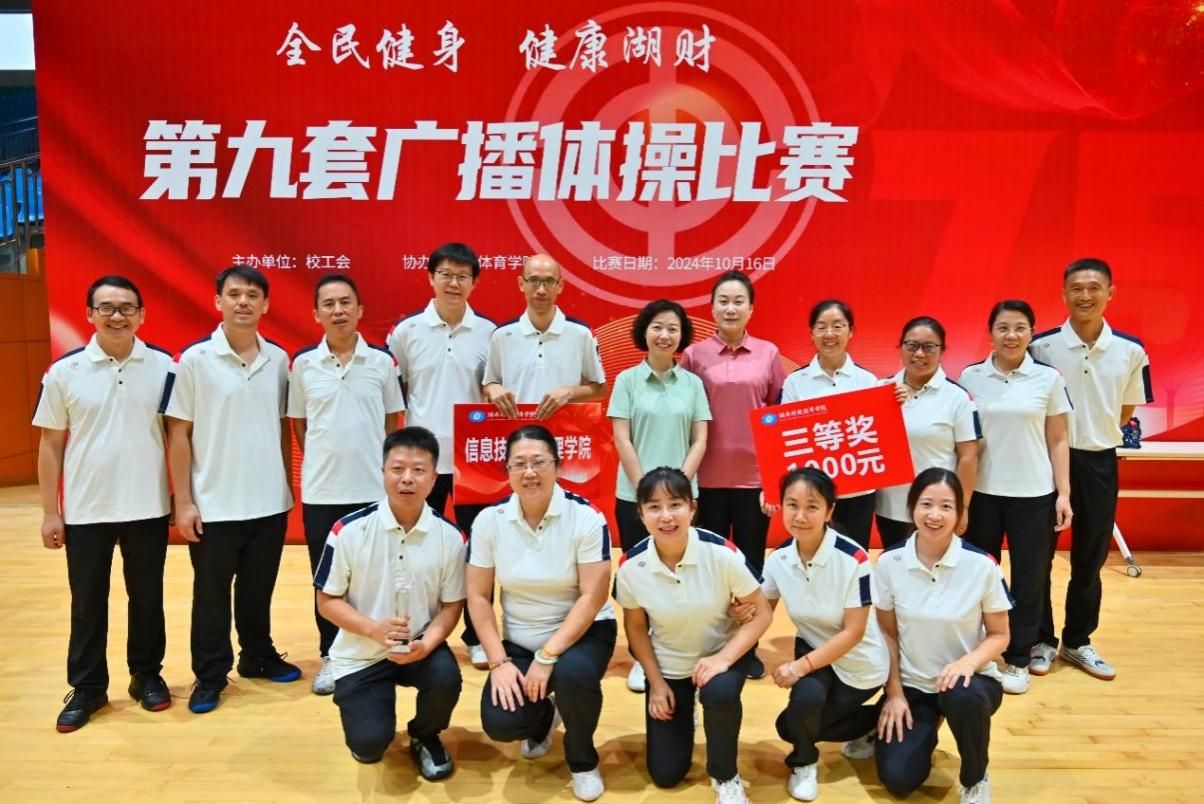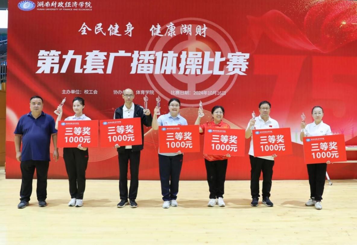 (本网讯)10月16日,“全民健身 健康湖财”2024年学校教职工第九套广播体操比赛在体育馆圆满落幕。全校共有18支队伍同台竞技,我院分工会代表队凭借出色的表现,荣获比赛三等奖,彰显了我院教职工团结拼搏、昂扬向上的精神风貌。