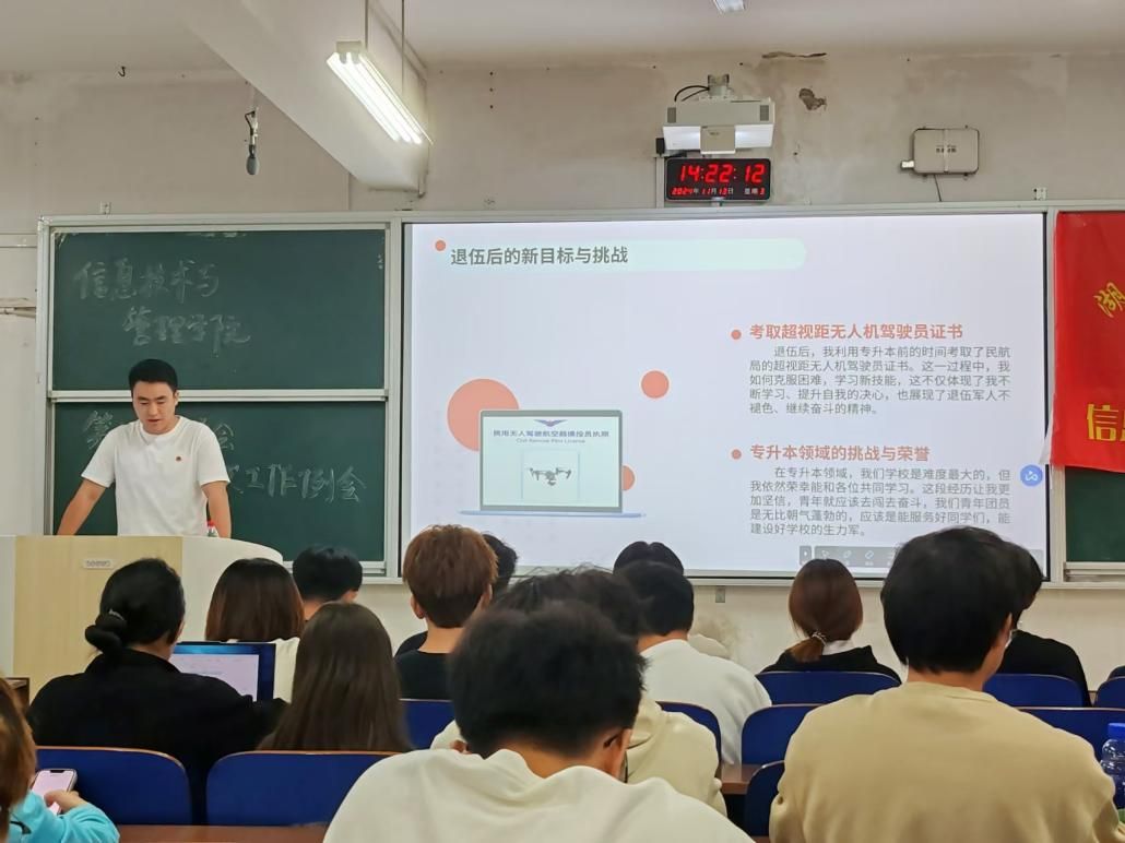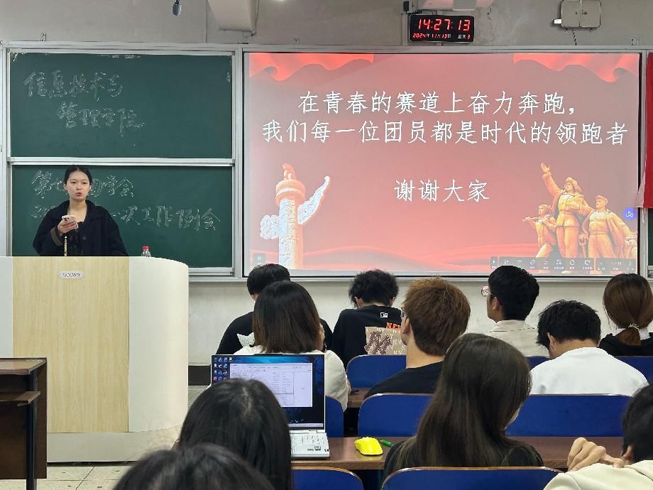 (本网讯)为深入贯彻落实党的二十届三中全会精神,充分发挥学生党支部战斗堡垒作用,引领广大青年学生当好党的助手和后备军,推动学院共青团工作提质增效,11月14日下午,信息技术与管理学院学生党员讲微团课暨第七届团学会第一次工作研讨会在三教学楼3210教室举行,活动由团总支办公室主任蒋磊主持,团总支书记李雨希,学生一支部党员、退伍军人廖俊祺以及第七届团学会全体学生干部参加。