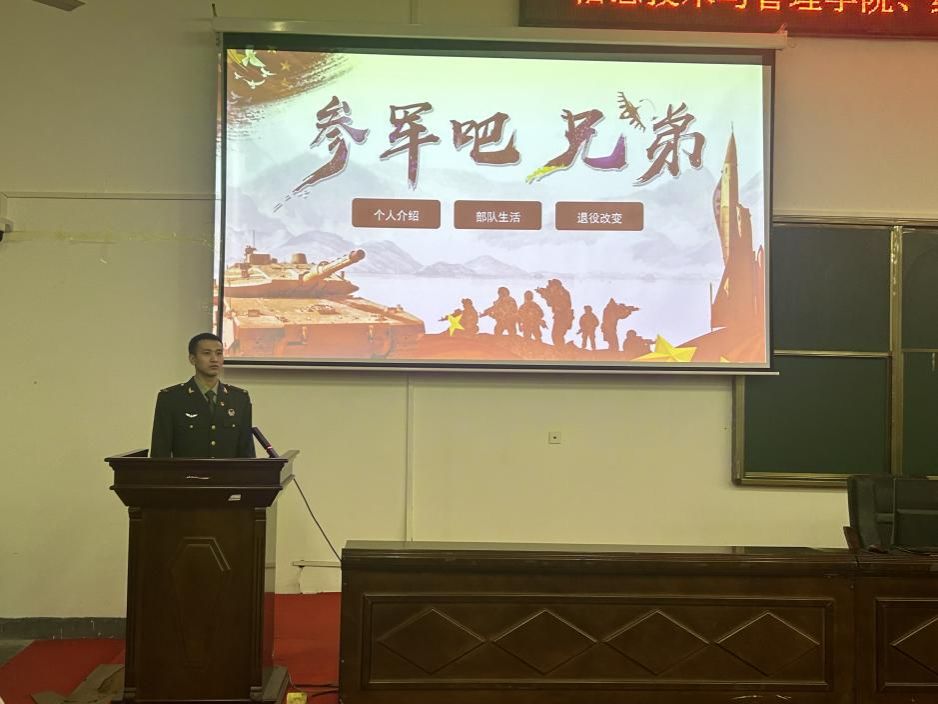 (本网讯)为积极响应国家征兵政策,鼓励青年大学生投身军旅,11月20日下午,信息技术与管理学院联合经济地理学院在第二教学楼2J01教室举办2025届毕业生应征入伍宣讲会。学生工作部、武装部挂职副部长龚若愚,国防教育科科长熊弋帅,信息技术与管理学院、经济地理学院全体毕业班辅导员,以及2025届毕业生参加了会议。