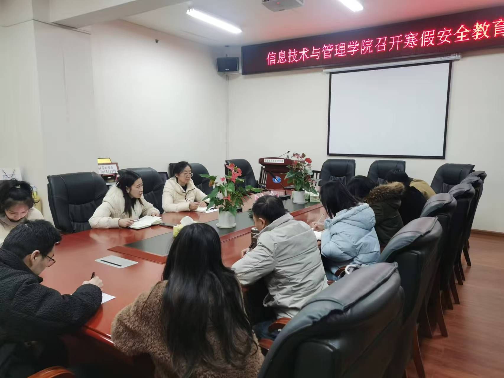 (本网讯)寒假在即,新春将至,为切实做好寒假期间学生的安全教育工作及留校学生的安全保障工作,确保学生度过一个平安、快乐的寒假,1月8日上午,信息技术与管理学院在办公楼315会议室召开寒假安全教育大会,会议由学院党委副书记唐雄伟主持,学工办副主任陈慧、全体专兼职辅导员参加会议。