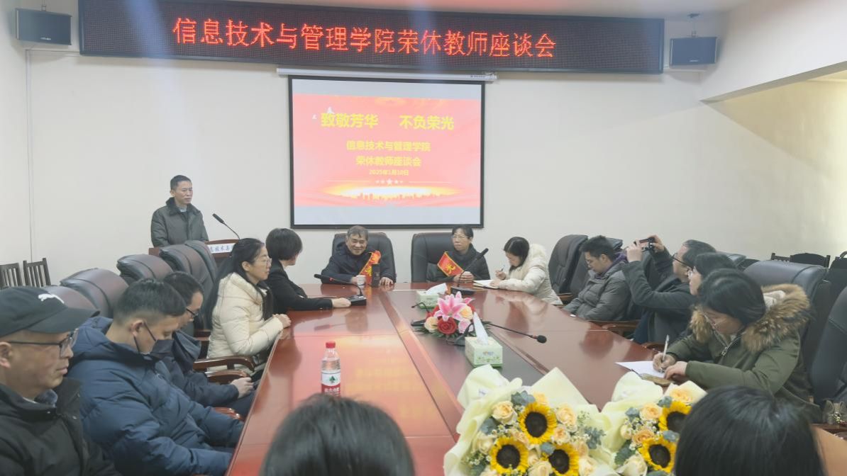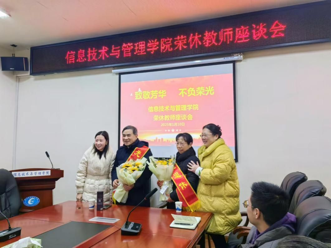 (本网讯)1月10日上午,信息技术与管理学院在办公楼315会议室举办了一场隆重而温馨的荣休仪式,以表达对谢建全、周益人两位教师多年辛勤耕耘的崇高敬意和美好祝福。仪式由学院分工会主席全立新主持,学院全体领导班子成员及教师代表参加。