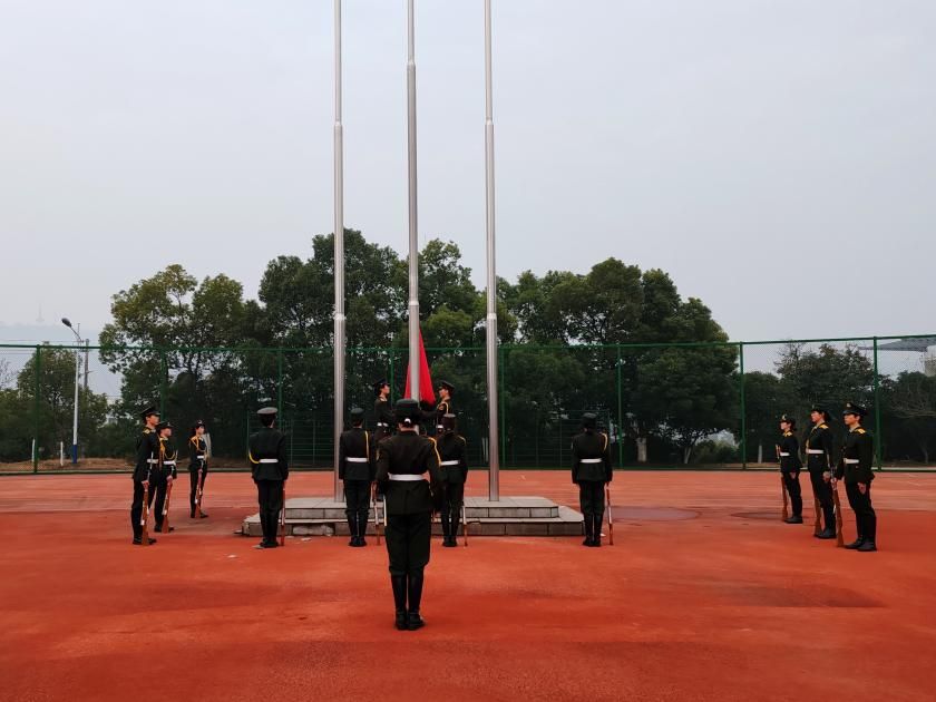 在嘹亮的口令声中,国旗班踏着铿锵步伐完成出旗仪式。随着雄壮激昂的国歌声响起,五星红旗在晨光中冉冉升起。师生庄严肃立,齐唱国歌。