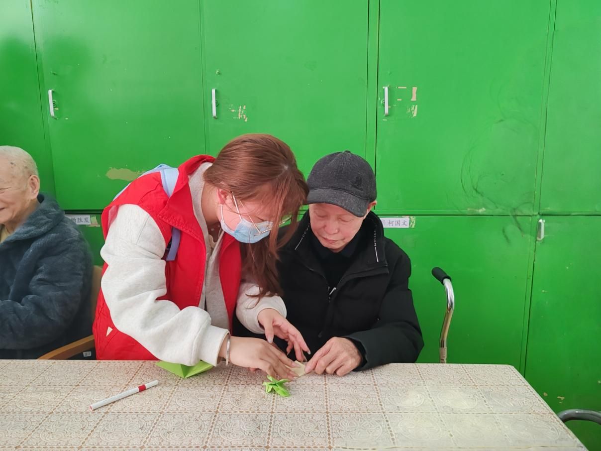 手工环节中,志愿者与老人两两结对,共同制作象征温暖的爱心和千纸鹤。老人们认真学习制作方法,一张张彩纸在大家手中变成了饱含心意的作品。志愿者还与老人一同进行书法创作,部分老人书法功底深厚,笔锋刚劲有力,赢得在场所有人的连声称赞。